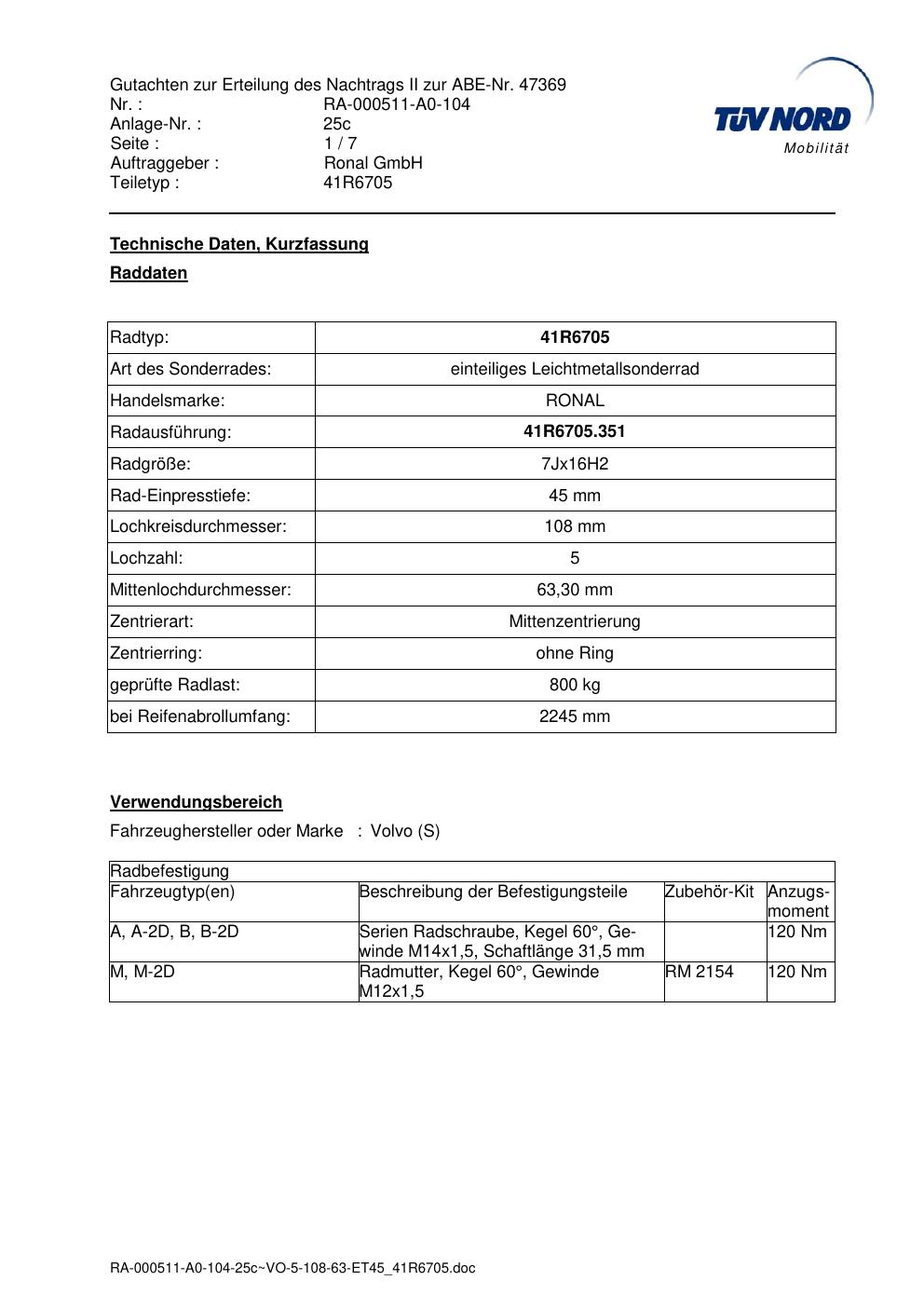 Dieses Gutachten (abe) bezieht sich auf die Alufelge brand-ronal 41R6705 in der Ausführung 7Jx16 ET 0, Mittenloch 0 mm (KBA 47369). Im PDF findest du typischerweise zulässige Reifengrößen, Auflagen/Anbauhinweise und – je nach Dokument – Hinweise zur Eintragung.