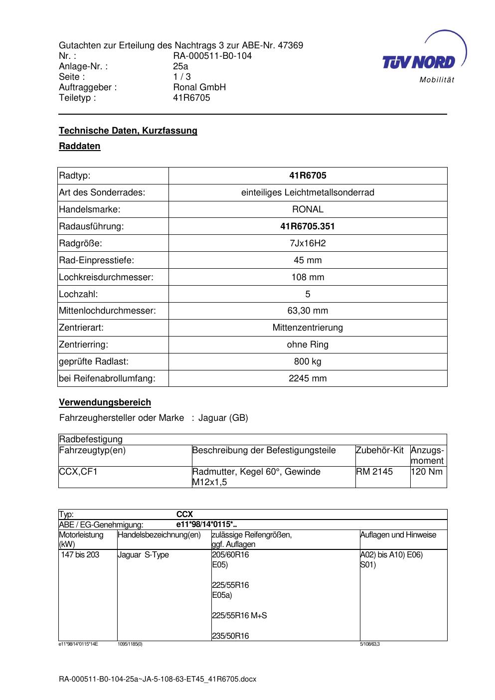 Dieses Gutachten (abe) bezieht sich auf die Alufelge brand-ronal 41R6705 in der Ausführung 7Jx16 ET 0, Mittenloch 0 mm (KBA 47369). Im PDF findest du typischerweise zulässige Reifengrößen, Auflagen/Anbauhinweise und – je nach Dokument – Hinweise zur Eintragung.