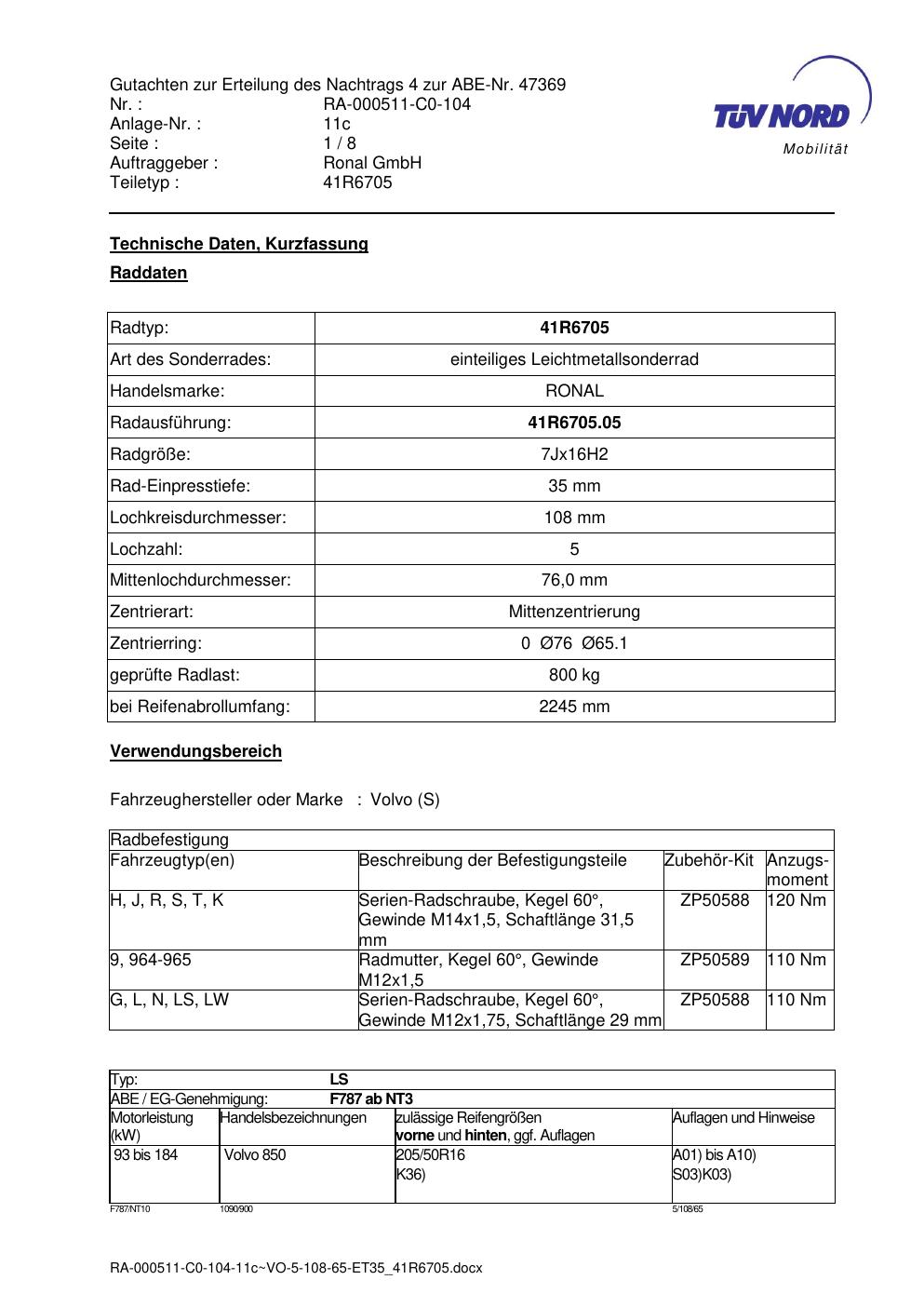 Dieses Gutachten (abe) bezieht sich auf die Alufelge brand-ronal 41R6705 in der Ausführung 7Jx16 ET 0, Mittenloch 0 mm (KBA 47369). Im PDF findest du typischerweise zulässige Reifengrößen, Auflagen/Anbauhinweise und – je nach Dokument – Hinweise zur Eintragung.