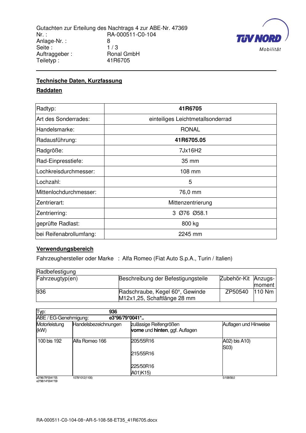 Dieses Gutachten (abe) bezieht sich auf die Alufelge brand-ronal 41R6705 in der Ausführung 7Jx16 ET 0, Mittenloch 0 mm (KBA 47369). Im PDF findest du typischerweise zulässige Reifengrößen, Auflagen/Anbauhinweise und – je nach Dokument – Hinweise zur Eintragung.