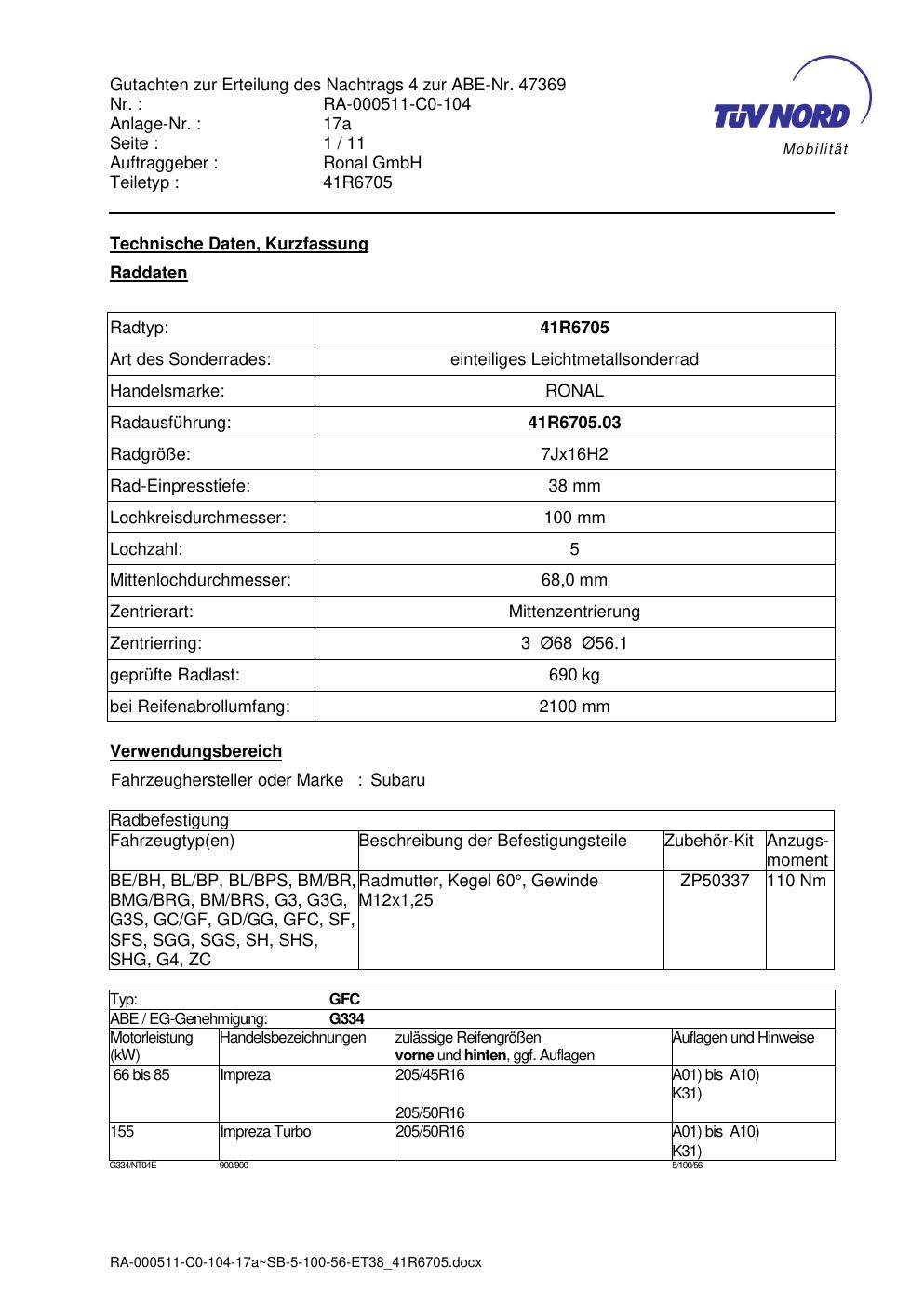 Dieses Gutachten (abe) bezieht sich auf die Alufelge brand-ronal 41R6705 in der Ausführung 7Jx16 ET 0, Mittenloch 0 mm (KBA 47369). Im PDF findest du typischerweise zulässige Reifengrößen, Auflagen/Anbauhinweise und – je nach Dokument – Hinweise zur Eintragung.