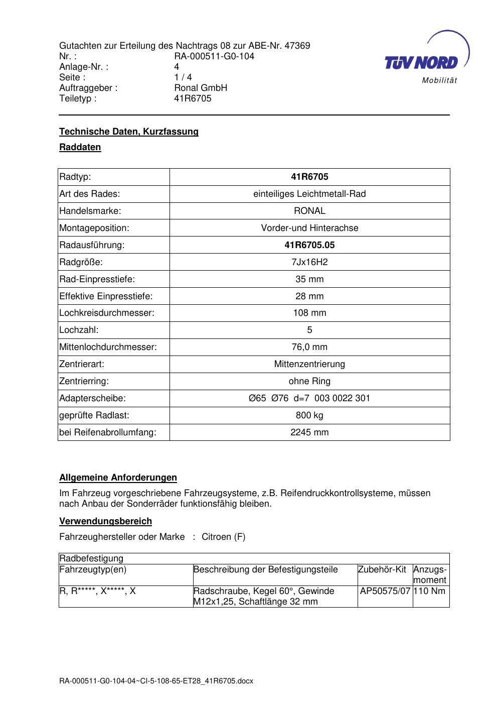 Dieses Gutachten (abe) bezieht sich auf die Alufelge brand-ronal 41R6705 in der Ausführung 7Jx16 ET 0, Mittenloch 0 mm (KBA 47369). Im PDF findest du typischerweise zulässige Reifengrößen, Auflagen/Anbauhinweise und – je nach Dokument – Hinweise zur Eintragung.