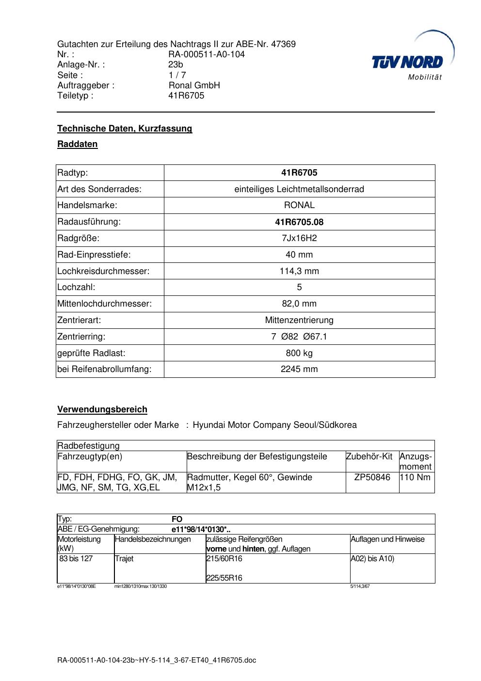 Dieses Gutachten (abe) bezieht sich auf die Alufelge brand-ronal 41R6705 in der Ausführung 7Jx16 ET 0, Mittenloch 0 mm (KBA 47369). Im PDF findest du typischerweise zulässige Reifengrößen, Auflagen/Anbauhinweise und – je nach Dokument – Hinweise zur Eintragung.