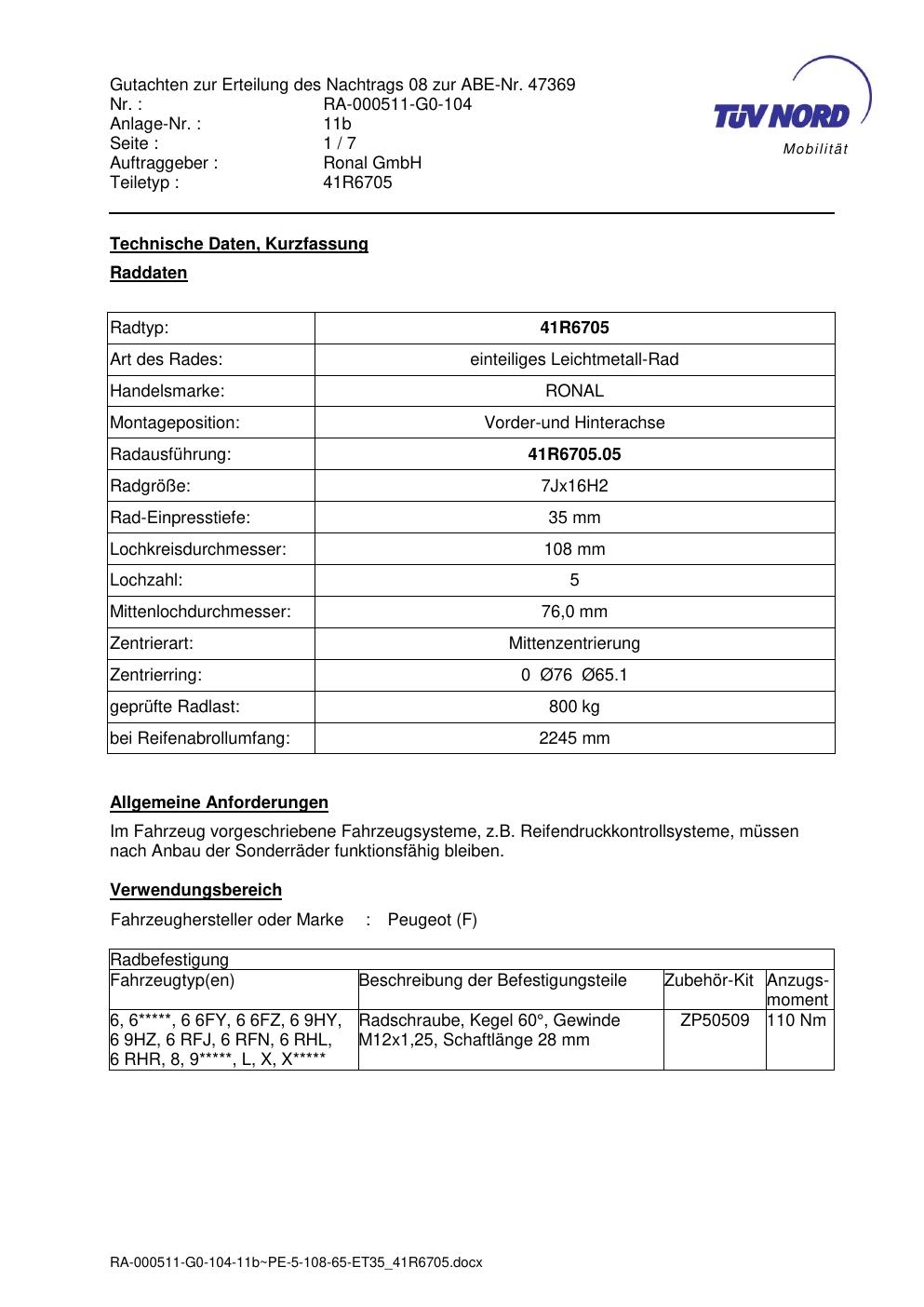 Dieses Gutachten (abe) bezieht sich auf die Alufelge brand-ronal 41R6705 in der Ausführung 7Jx16 ET 0, Mittenloch 0 mm (KBA 47369). Im PDF findest du typischerweise zulässige Reifengrößen, Auflagen/Anbauhinweise und – je nach Dokument – Hinweise zur Eintragung.