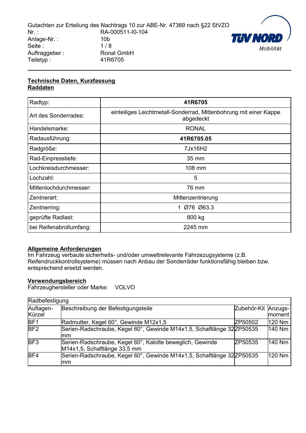 Dieses Gutachten (abe) bezieht sich auf die Alufelge brand-ronal 41R6705 in der Ausführung 7Jx16 ET 0, Mittenloch 0 mm (KBA 47369). Im PDF findest du typischerweise zulässige Reifengrößen, Auflagen/Anbauhinweise und – je nach Dokument – Hinweise zur Eintragung.