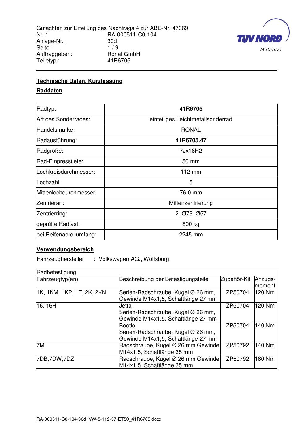 Dieses Gutachten (abe) bezieht sich auf die Alufelge brand-ronal 41R6705 in der Ausführung 7Jx16 ET 0, Mittenloch 0 mm (KBA 47369). Im PDF findest du typischerweise zulässige Reifengrößen, Auflagen/Anbauhinweise und – je nach Dokument – Hinweise zur Eintragung.