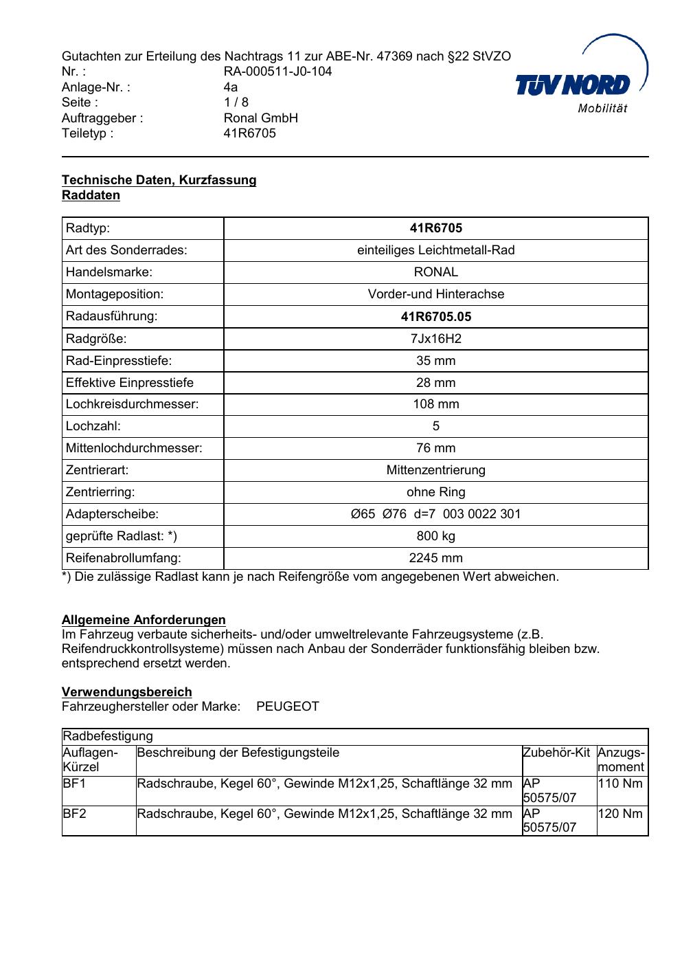 Dieses Gutachten (abe) bezieht sich auf die Alufelge brand-ronal 41R6705 in der Ausführung 7Jx16 ET 0, Mittenloch 0 mm (KBA 47369). Im PDF findest du typischerweise zulässige Reifengrößen, Auflagen/Anbauhinweise und – je nach Dokument – Hinweise zur Eintragung.