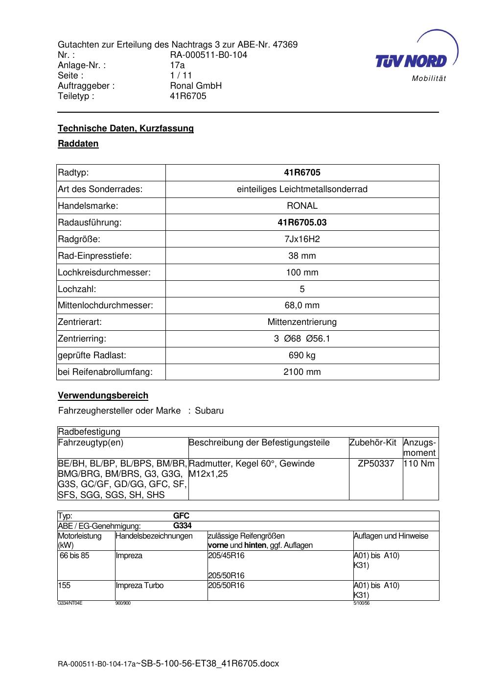 Dieses Gutachten (abe) bezieht sich auf die Alufelge brand-ronal 41R6705 in der Ausführung 7Jx16 ET 0, Mittenloch 0 mm (KBA 47369). Im PDF findest du typischerweise zulässige Reifengrößen, Auflagen/Anbauhinweise und – je nach Dokument – Hinweise zur Eintragung.