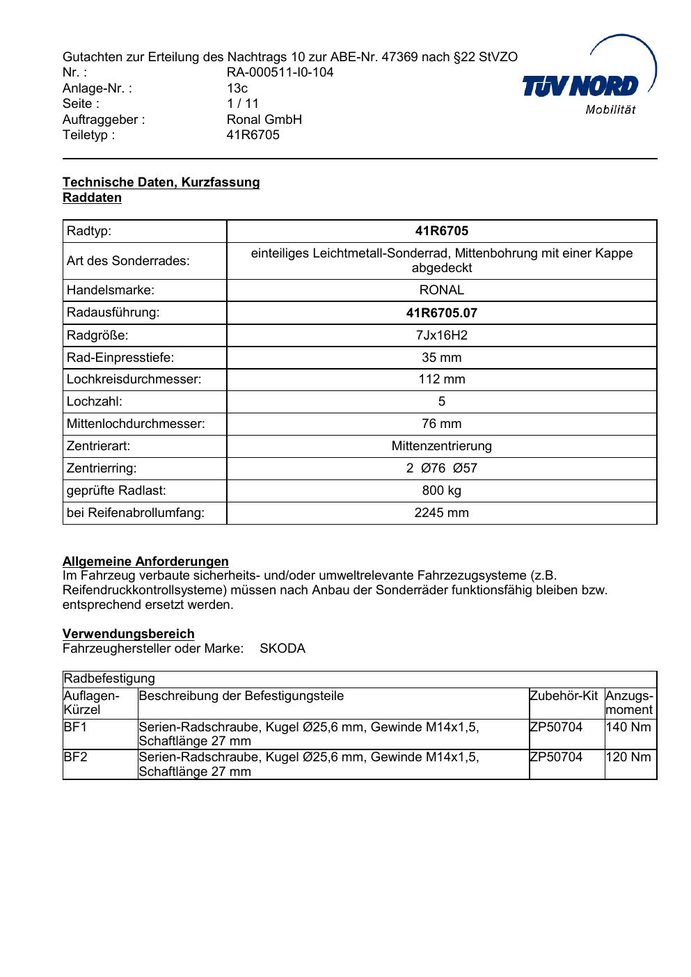 Dieses Gutachten (abe) bezieht sich auf die Alufelge brand-ronal 41R6705 in der Ausführung 7Jx16 ET 0, Mittenloch 0 mm (KBA 47369). Im PDF findest du typischerweise zulässige Reifengrößen, Auflagen/Anbauhinweise und – je nach Dokument – Hinweise zur Eintragung.