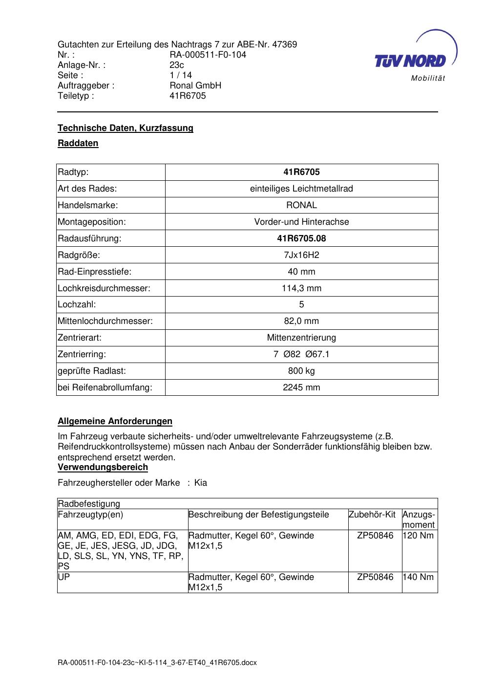Dieses Gutachten (abe) bezieht sich auf die Alufelge brand-ronal 41R6705 in der Ausführung 7Jx16 ET 0, Mittenloch 0 mm (KBA 47369). Im PDF findest du typischerweise zulässige Reifengrößen, Auflagen/Anbauhinweise und – je nach Dokument – Hinweise zur Eintragung.