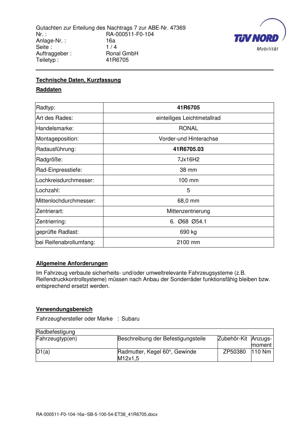 Dieses Gutachten (abe) bezieht sich auf die Alufelge brand-ronal 41R6705 in der Ausführung 7Jx16 ET 0, Mittenloch 0 mm (KBA 47369). Im PDF findest du typischerweise zulässige Reifengrößen, Auflagen/Anbauhinweise und – je nach Dokument – Hinweise zur Eintragung.