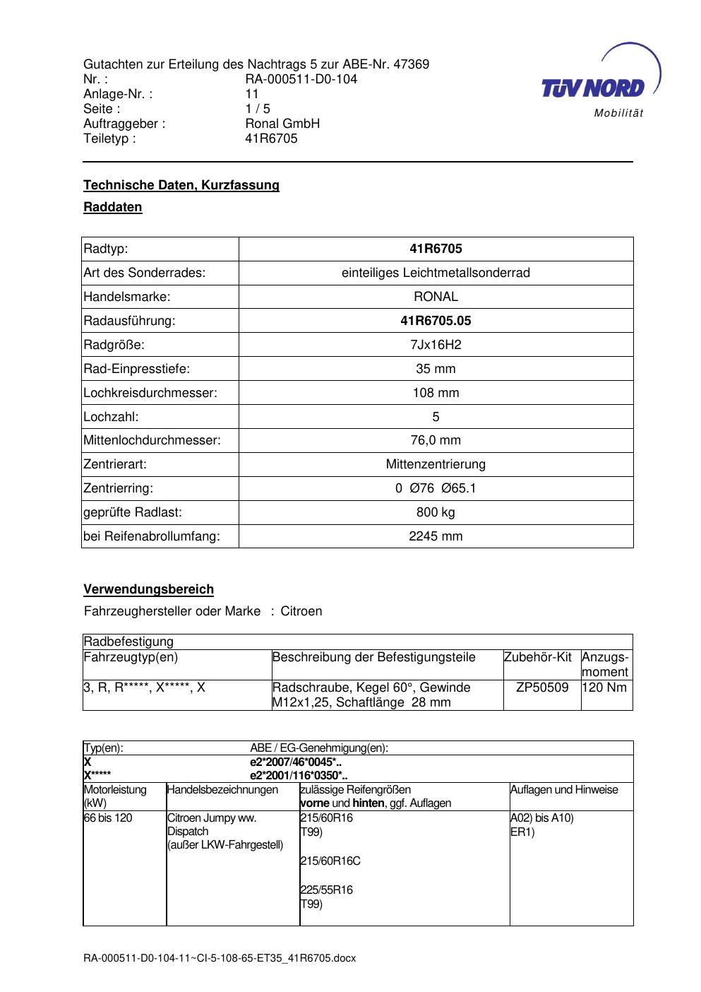 Dieses Gutachten (abe) bezieht sich auf die Alufelge brand-ronal 41R6705 in der Ausführung 7Jx16 ET 0, Mittenloch 0 mm (KBA 47369). Im PDF findest du typischerweise zulässige Reifengrößen, Auflagen/Anbauhinweise und – je nach Dokument – Hinweise zur Eintragung.