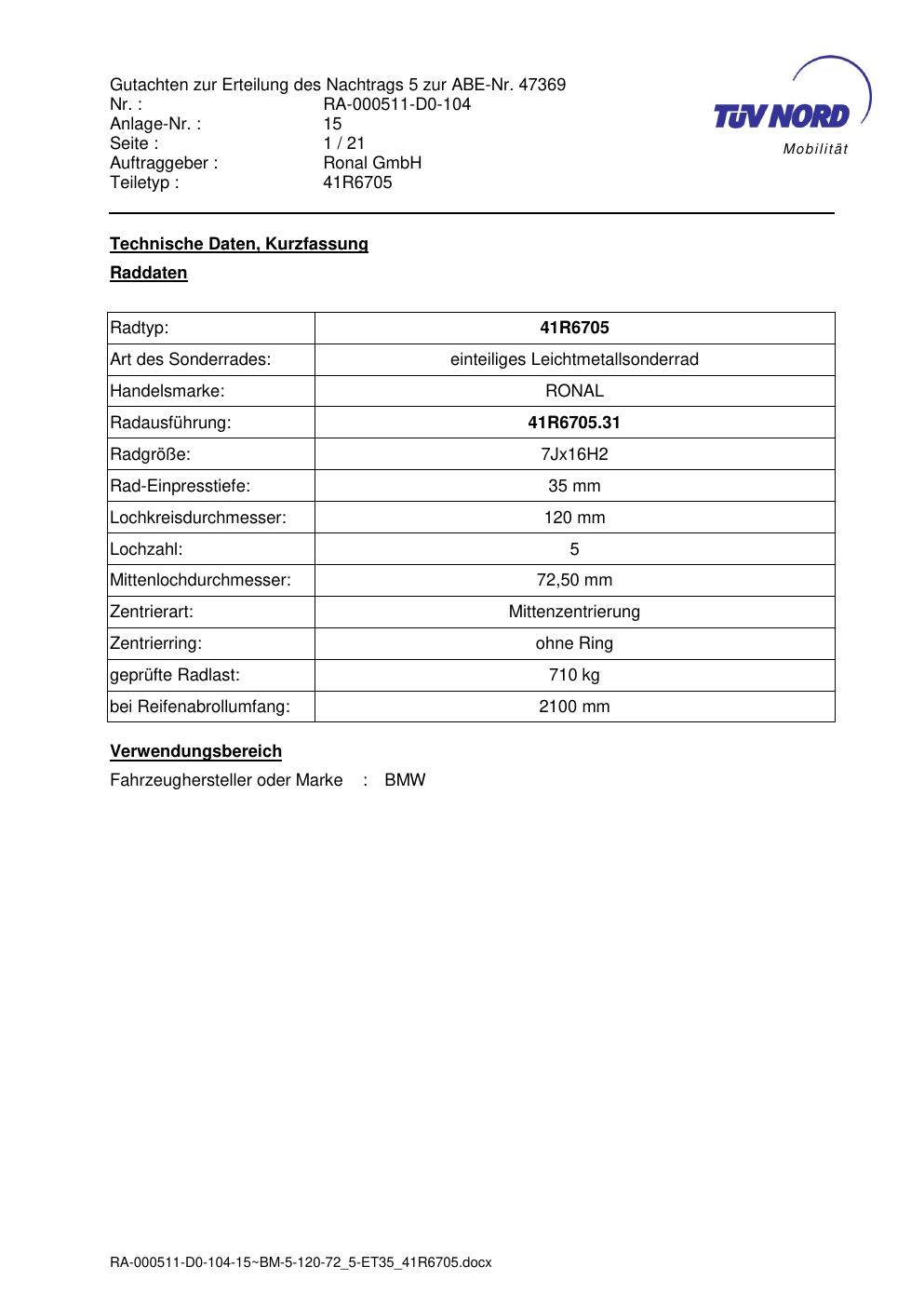Dieses Gutachten (abe) bezieht sich auf die Alufelge Ronal 41R6705 in der Ausführung 7Jx16 ET 0, Mittenloch 0 mm (KBA 47369). Im PDF findest du typischerweise zulässige Reifengrößen, Auflagen/Anbauhinweise und – je nach Dokument – Hinweise zur Eintragung.