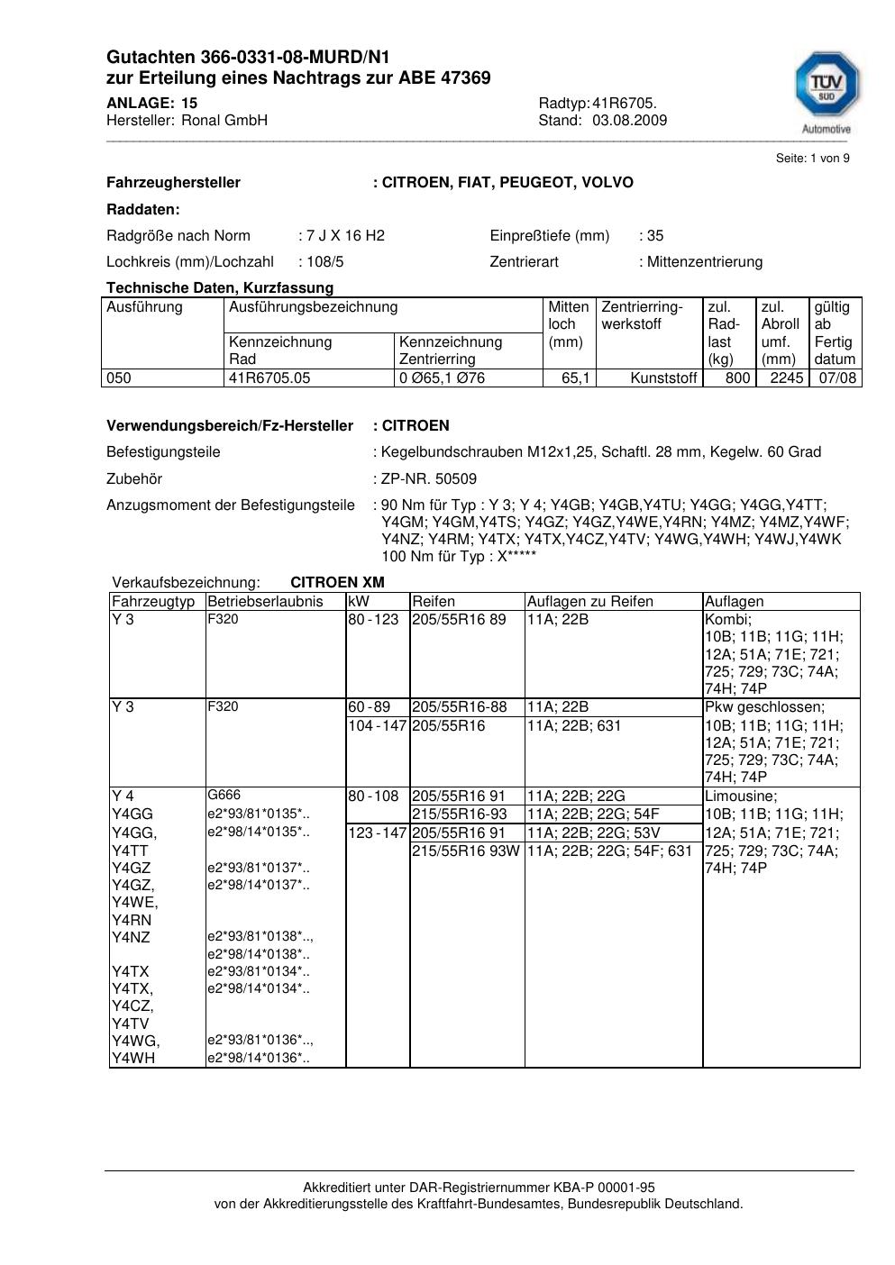 Dieses Gutachten (abe) bezieht sich auf die Alufelge Ronal 41R6705 in der Ausführung 7Jx16 ET 0, Mittenloch 0 mm (KBA 47369). Im PDF findest du typischerweise zulässige Reifengrößen, Auflagen/Anbauhinweise und – je nach Dokument – Hinweise zur Eintragung.