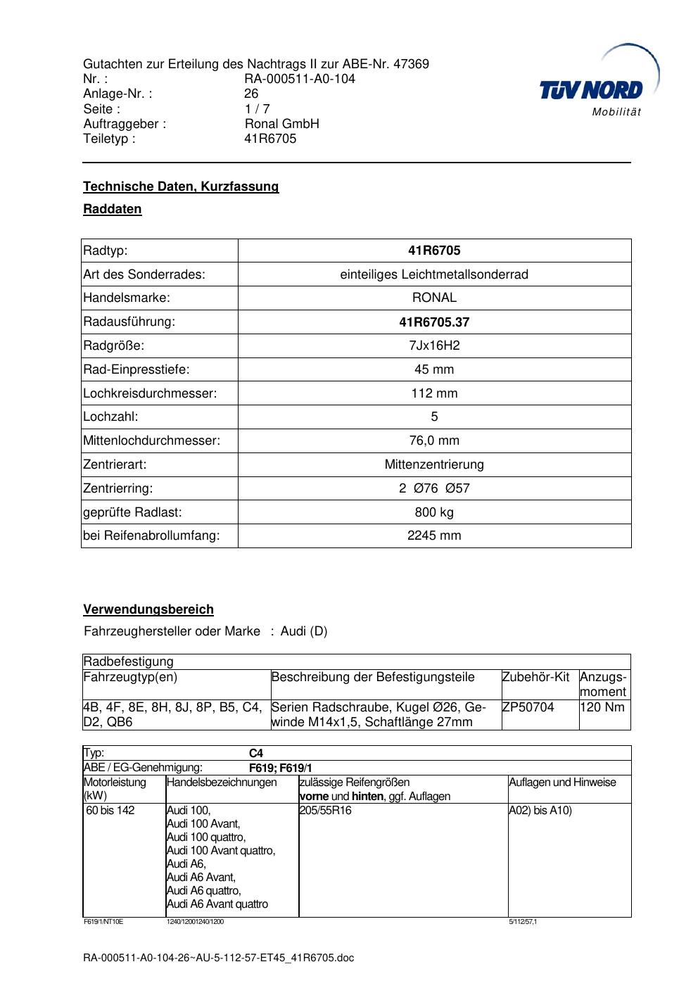 Dieses Gutachten (abe) bezieht sich auf die Alufelge brand-ronal 41R6705 in der Ausführung 7Jx16 ET 0, Mittenloch 0 mm (KBA 47369). Im PDF findest du typischerweise zulässige Reifengrößen, Auflagen/Anbauhinweise und – je nach Dokument – Hinweise zur Eintragung.