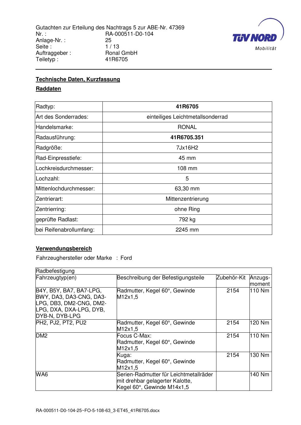 Dieses Gutachten (abe) bezieht sich auf die Alufelge brand-ronal 41R6705 in der Ausführung 7Jx16 ET 0, Mittenloch 0 mm (KBA 47369). Im PDF findest du typischerweise zulässige Reifengrößen, Auflagen/Anbauhinweise und – je nach Dokument – Hinweise zur Eintragung.