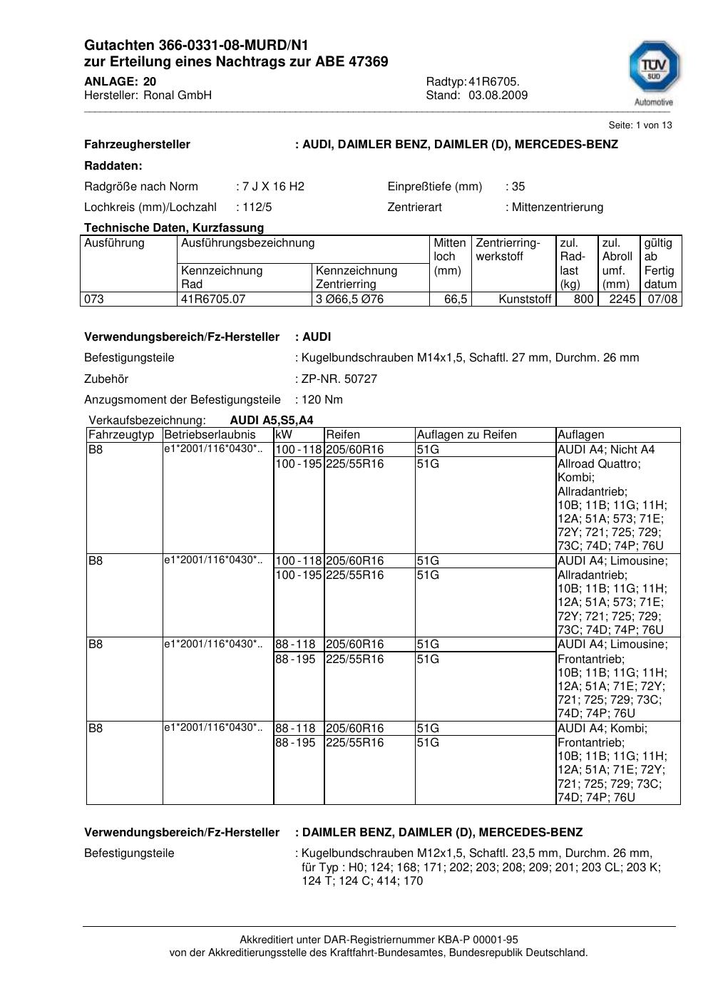 Dieses Gutachten (abe) bezieht sich auf die Alufelge Ronal 41R6705 in der Ausführung 7Jx16 ET 0, Mittenloch 0 mm (KBA 47369). Im PDF findest du typischerweise zulässige Reifengrößen, Auflagen/Anbauhinweise und – je nach Dokument – Hinweise zur Eintragung.