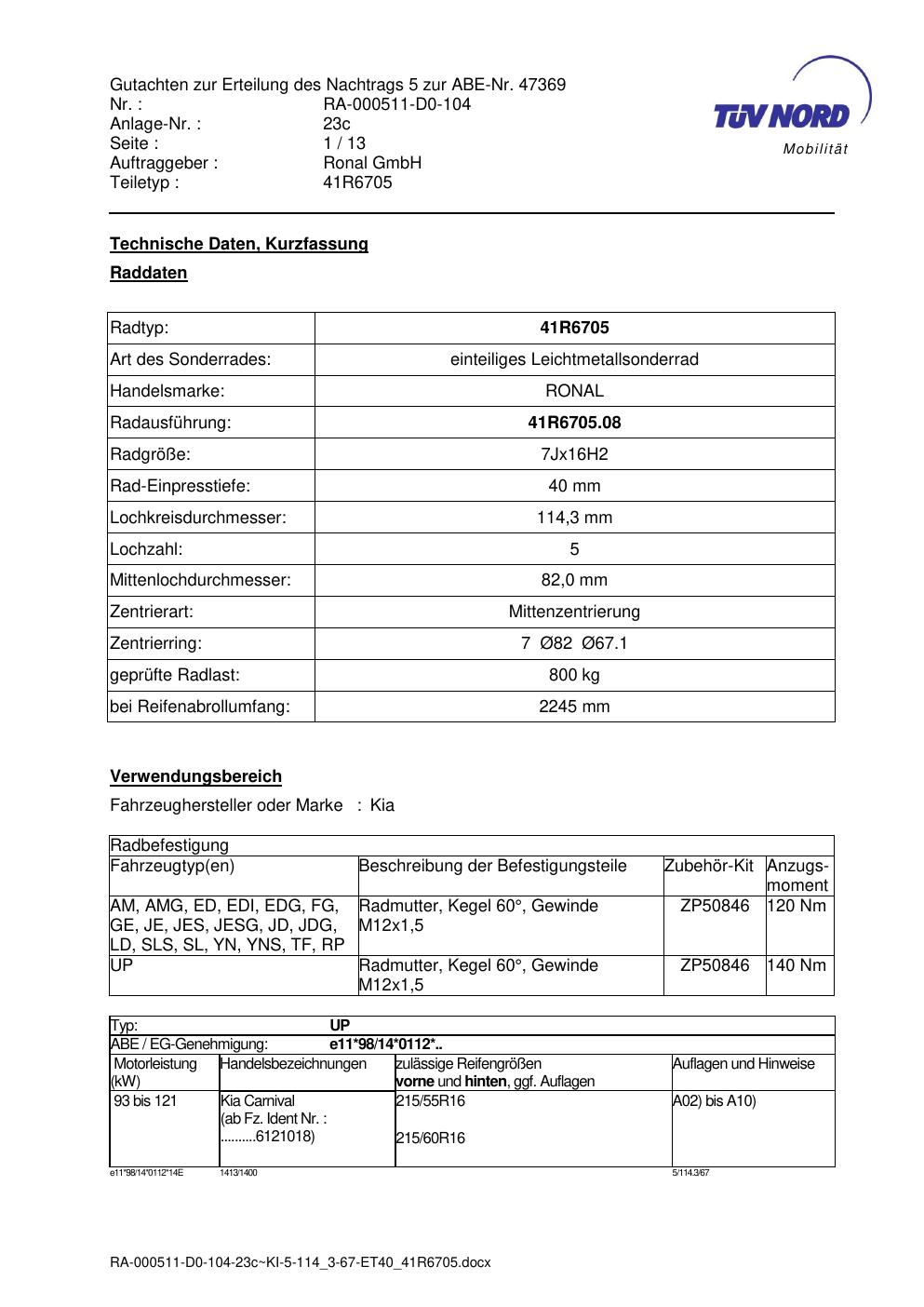 Dieses Gutachten (abe) bezieht sich auf die Alufelge brand-ronal 41R6705 in der Ausführung 7Jx16 ET 0, Mittenloch 0 mm (KBA 47369). Im PDF findest du typischerweise zulässige Reifengrößen, Auflagen/Anbauhinweise und – je nach Dokument – Hinweise zur Eintragung.