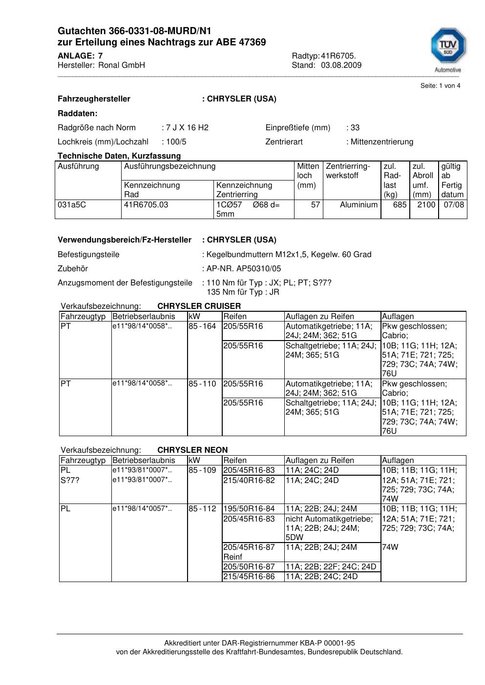 Dieses Gutachten (abe) bezieht sich auf die Alufelge brand-ronal 41R6705 in der Ausführung 7Jx16 ET 0, Mittenloch 0 mm (KBA 47369). Im PDF findest du typischerweise zulässige Reifengrößen, Auflagen/Anbauhinweise und – je nach Dokument – Hinweise zur Eintragung.