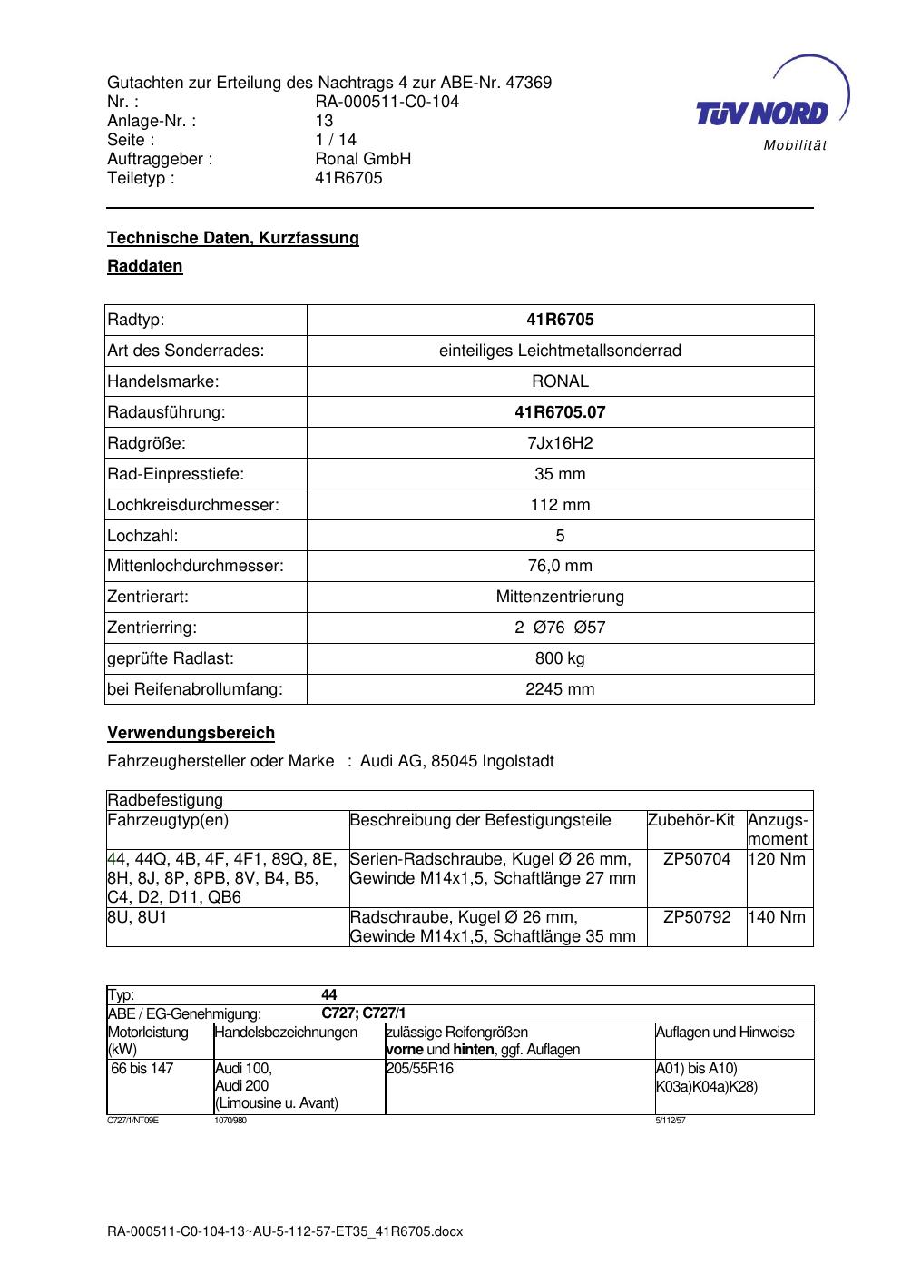 Dieses Gutachten (abe) bezieht sich auf die Alufelge brand-ronal 41R6705 in der Ausführung 7Jx16 ET 0, Mittenloch 0 mm (KBA 47369). Im PDF findest du typischerweise zulässige Reifengrößen, Auflagen/Anbauhinweise und – je nach Dokument – Hinweise zur Eintragung.