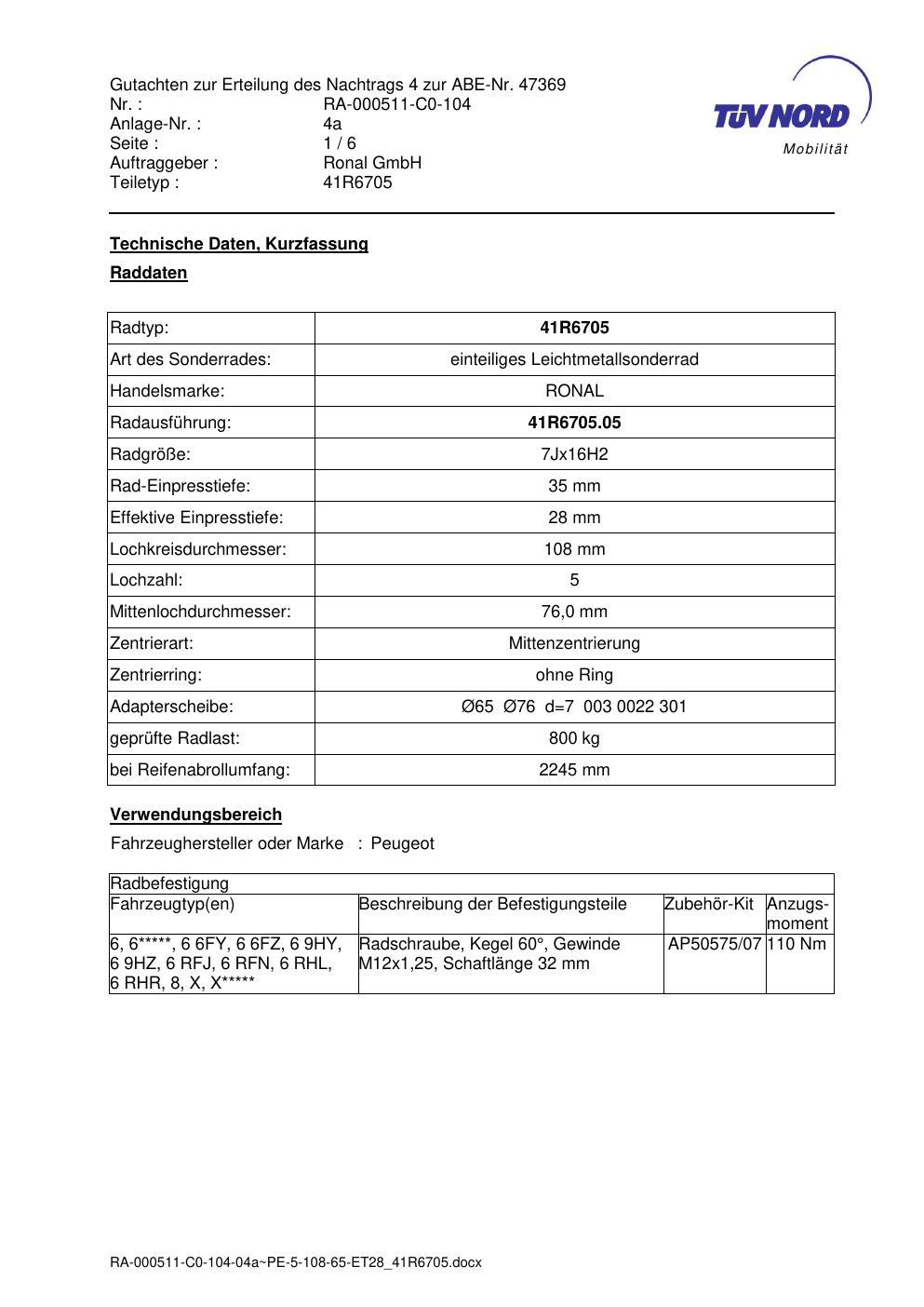 Dieses Gutachten (abe) bezieht sich auf die Alufelge brand-ronal 41R6705 in der Ausführung 7Jx16 ET 0, Mittenloch 0 mm (KBA 47369). Im PDF findest du typischerweise zulässige Reifengrößen, Auflagen/Anbauhinweise und – je nach Dokument – Hinweise zur Eintragung.