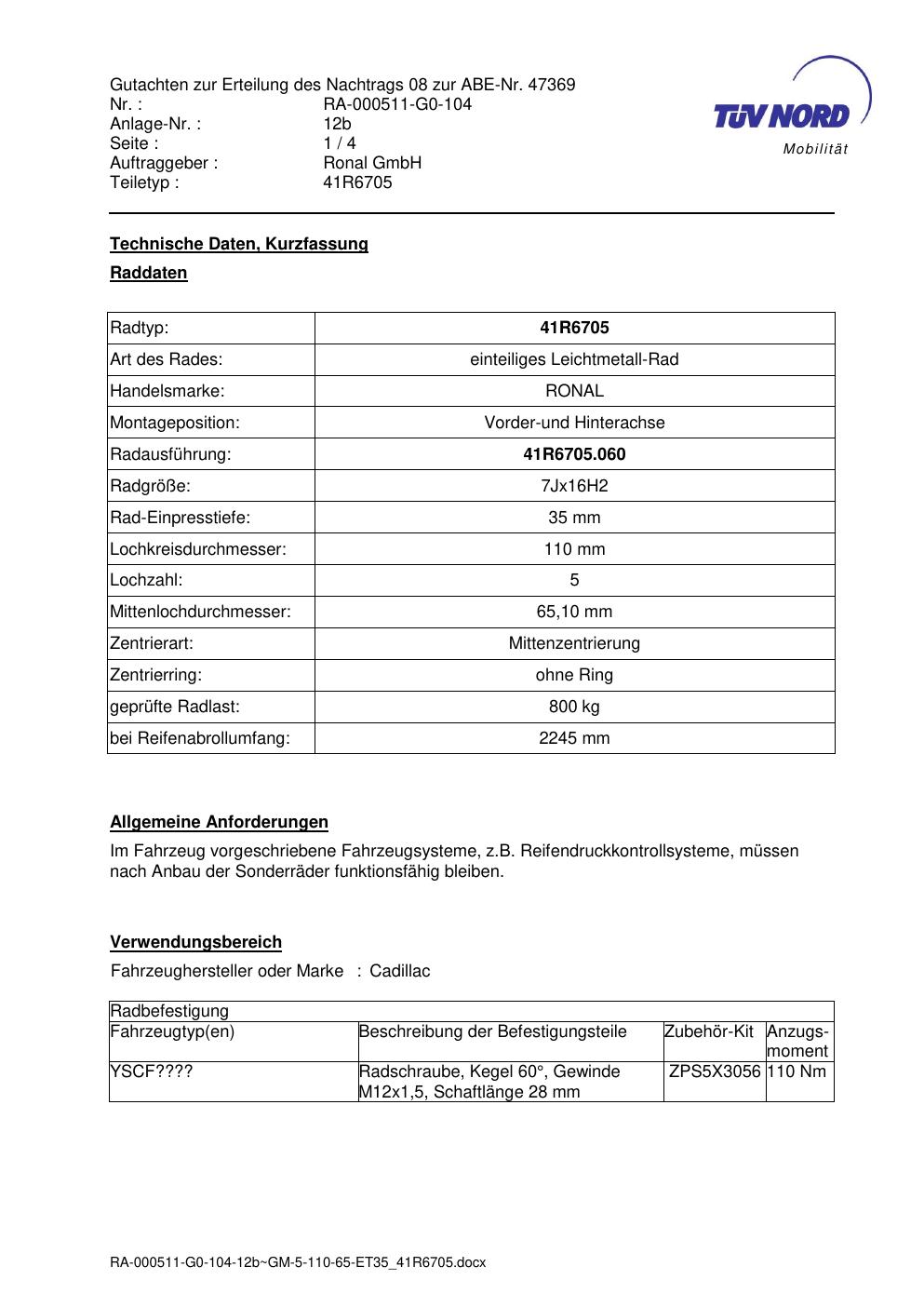 Dieses Gutachten (abe) bezieht sich auf die Alufelge brand-ronal 41R6705 in der Ausführung 7Jx16 ET 0, Mittenloch 0 mm (KBA 47369). Im PDF findest du typischerweise zulässige Reifengrößen, Auflagen/Anbauhinweise und – je nach Dokument – Hinweise zur Eintragung.