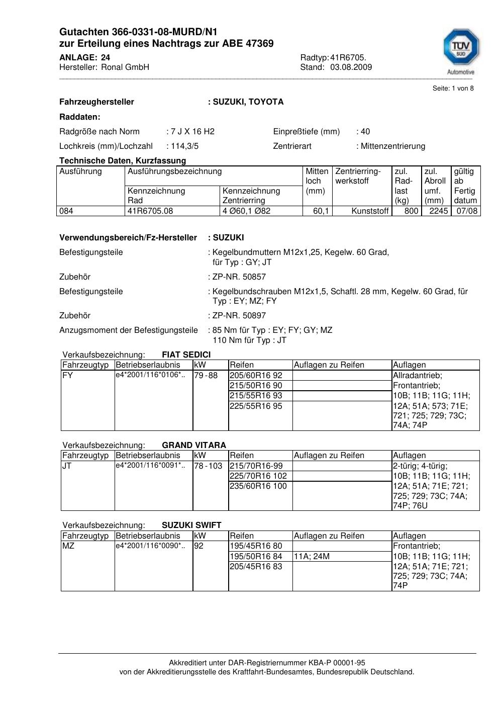 Dieses Gutachten (abe) bezieht sich auf die Alufelge Ronal 41R6705 in der Ausführung 7Jx16 ET 0, Mittenloch 0 mm (KBA 47369). Im PDF findest du typischerweise zulässige Reifengrößen, Auflagen/Anbauhinweise und – je nach Dokument – Hinweise zur Eintragung.