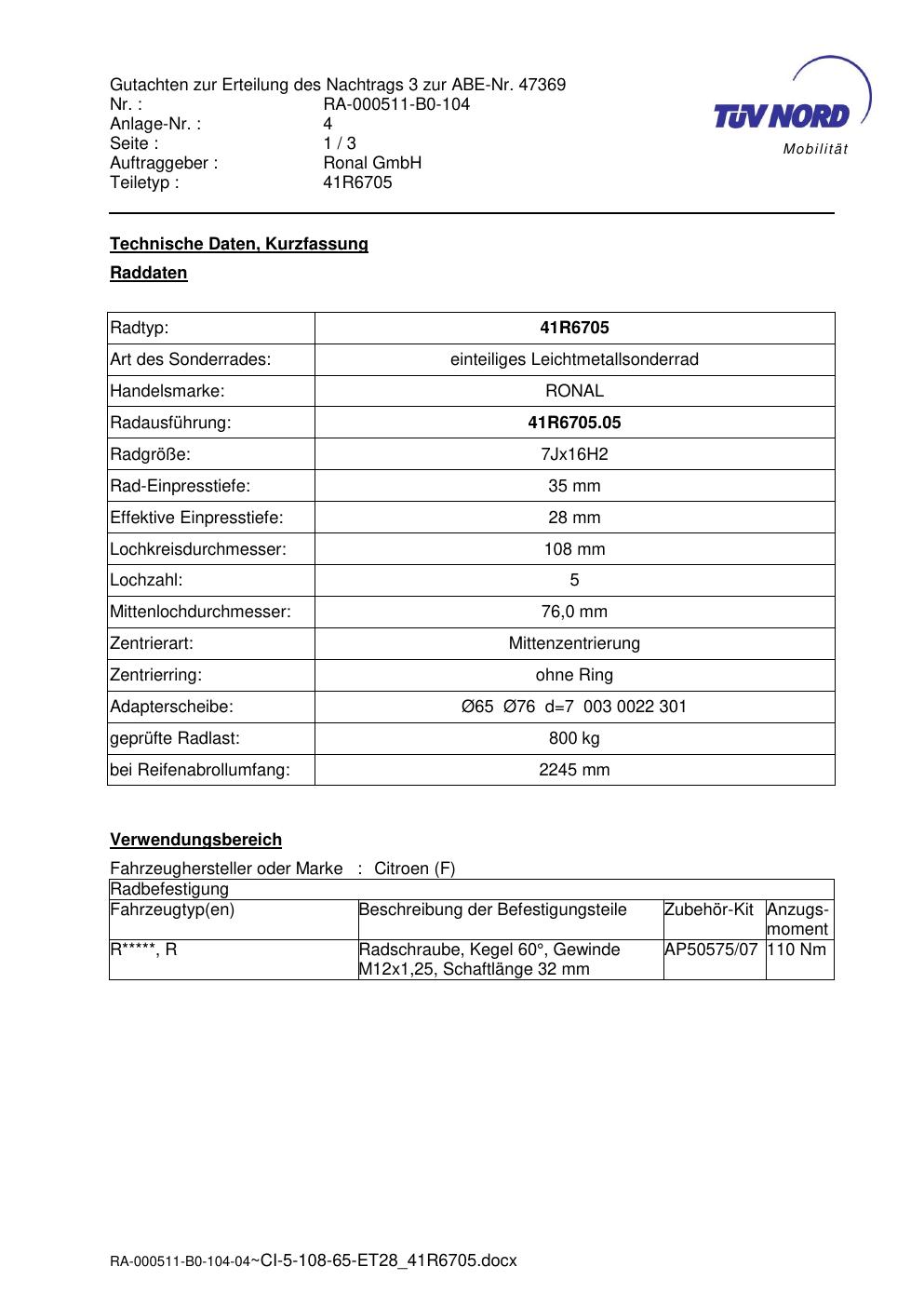 Dieses Gutachten (abe) bezieht sich auf die Alufelge brand-ronal 41R6705 in der Ausführung 7Jx16 ET 0, Mittenloch 0 mm (KBA 47369). Im PDF findest du typischerweise zulässige Reifengrößen, Auflagen/Anbauhinweise und – je nach Dokument – Hinweise zur Eintragung.