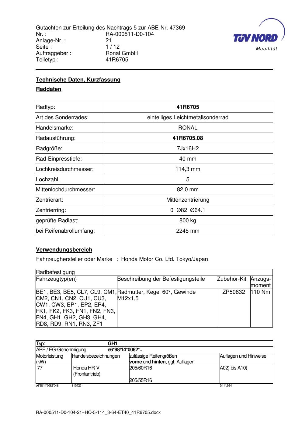 Dieses Gutachten (abe) bezieht sich auf die Alufelge brand-ronal 41R6705 in der Ausführung 7Jx16 ET 0, Mittenloch 0 mm (KBA 47369). Im PDF findest du typischerweise zulässige Reifengrößen, Auflagen/Anbauhinweise und – je nach Dokument – Hinweise zur Eintragung.