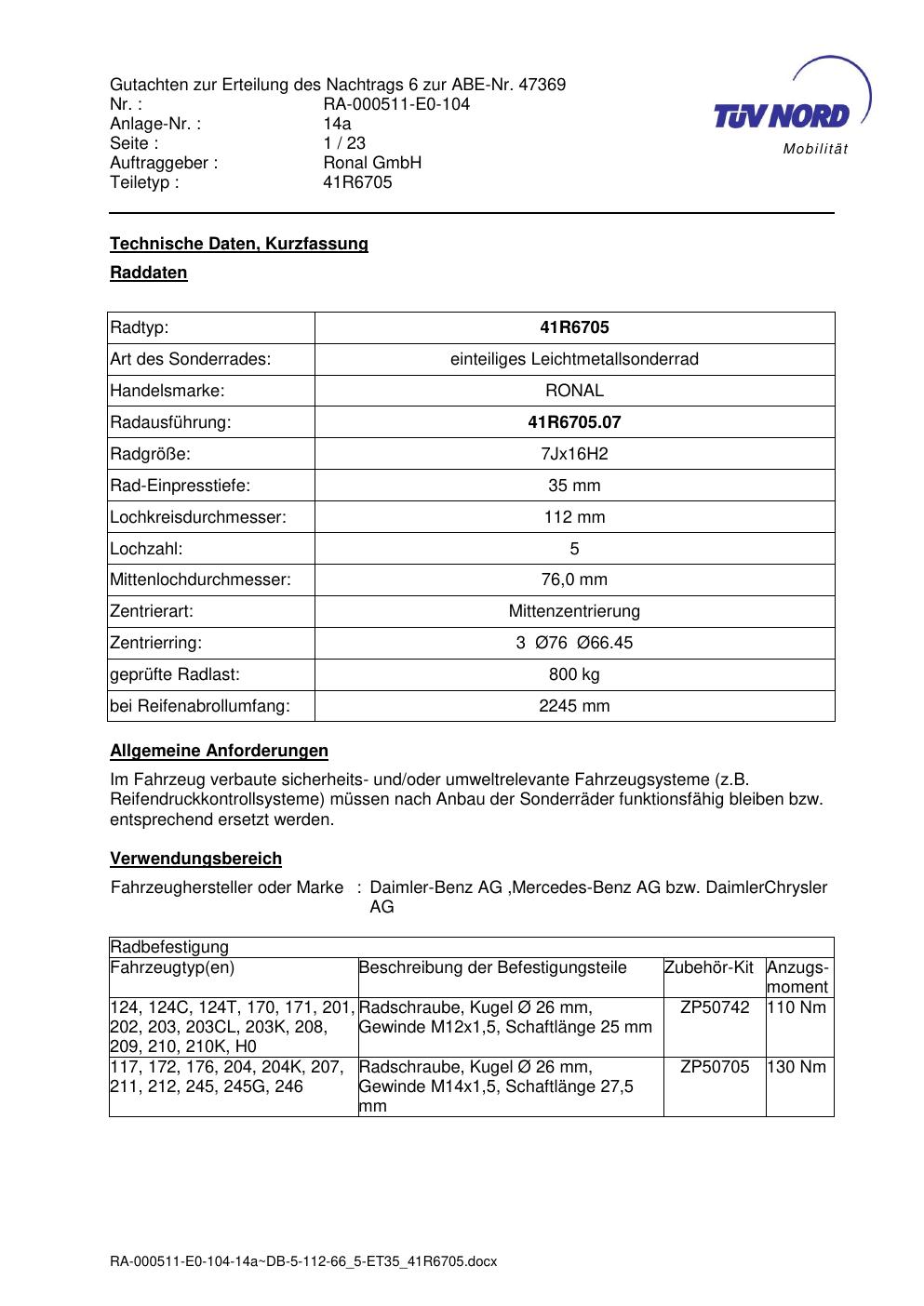 Dieses Gutachten (abe) bezieht sich auf die Alufelge brand-ronal 41R6705 in der Ausführung 7Jx16 ET 0, Mittenloch 0 mm (KBA 47369). Im PDF findest du typischerweise zulässige Reifengrößen, Auflagen/Anbauhinweise und – je nach Dokument – Hinweise zur Eintragung.