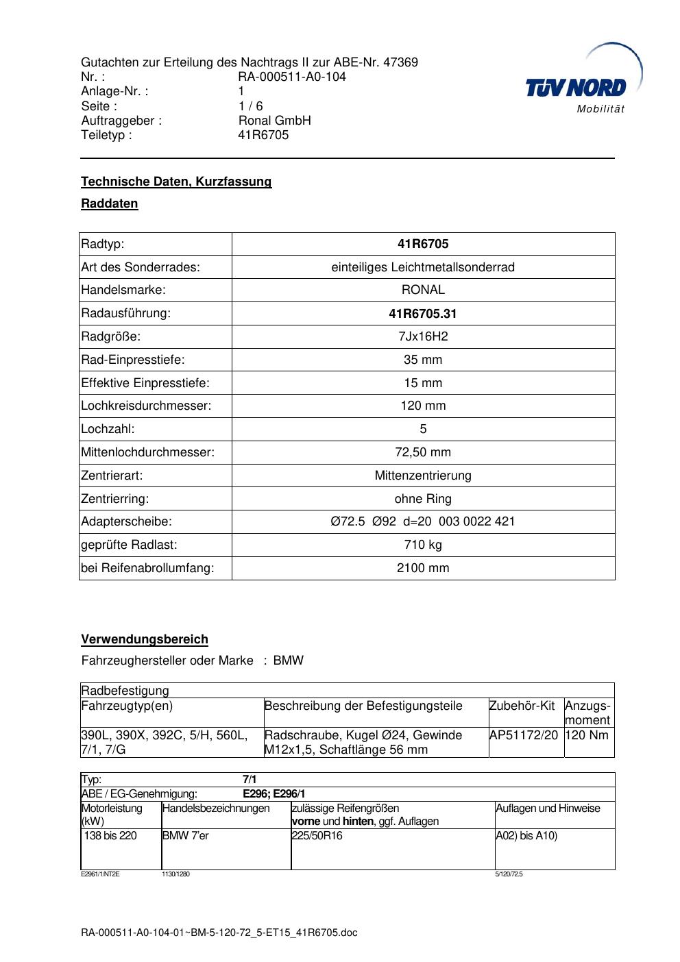 Dieses Gutachten (abe) bezieht sich auf die Alufelge brand-ronal 41R6705 in der Ausführung 7Jx16 ET 0, Mittenloch 0 mm (KBA 47369). Im PDF findest du typischerweise zulässige Reifengrößen, Auflagen/Anbauhinweise und – je nach Dokument – Hinweise zur Eintragung.