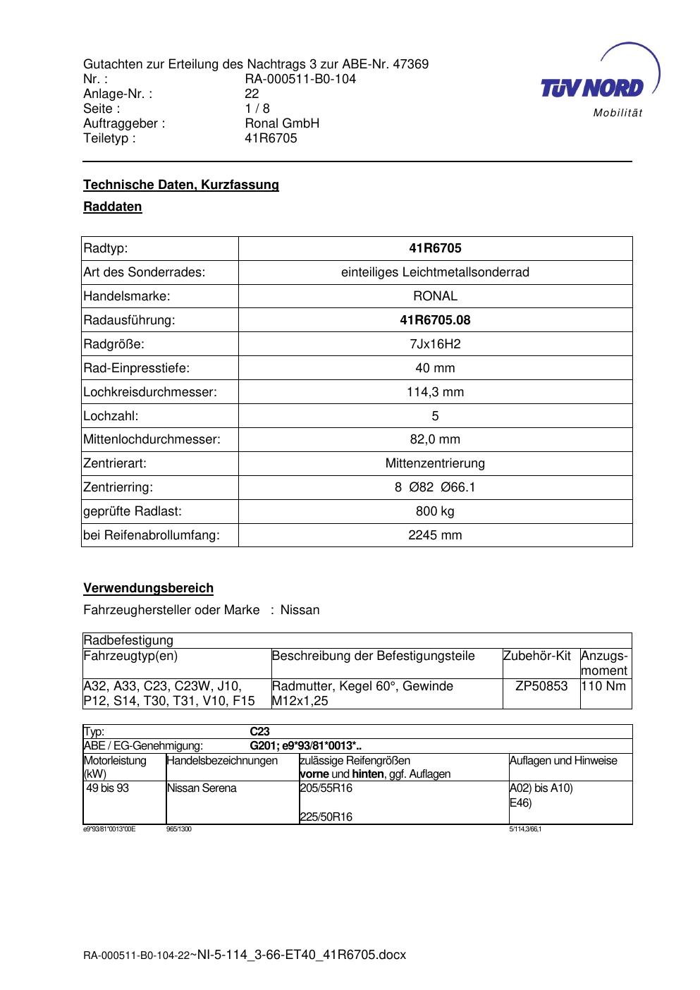 Dieses Gutachten (abe) bezieht sich auf die Alufelge brand-ronal 41R6705 in der Ausführung 7Jx16 ET 0, Mittenloch 0 mm (KBA 47369). Im PDF findest du typischerweise zulässige Reifengrößen, Auflagen/Anbauhinweise und – je nach Dokument – Hinweise zur Eintragung.