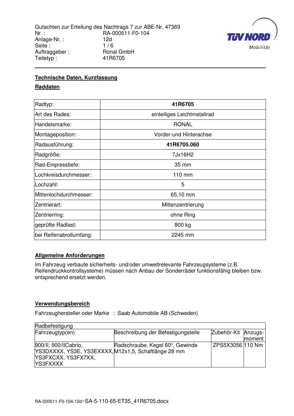 Dieses Gutachten (abe) bezieht sich auf die Alufelge brand-ronal 41R6705 in der Ausführung 7Jx16 ET 0, Mittenloch 0 mm (KBA 47369). Im PDF findest du typischerweise zulässige Reifengrößen, Auflagen/Anbauhinweise und – je nach Dokument – Hinweise zur Eintragung.