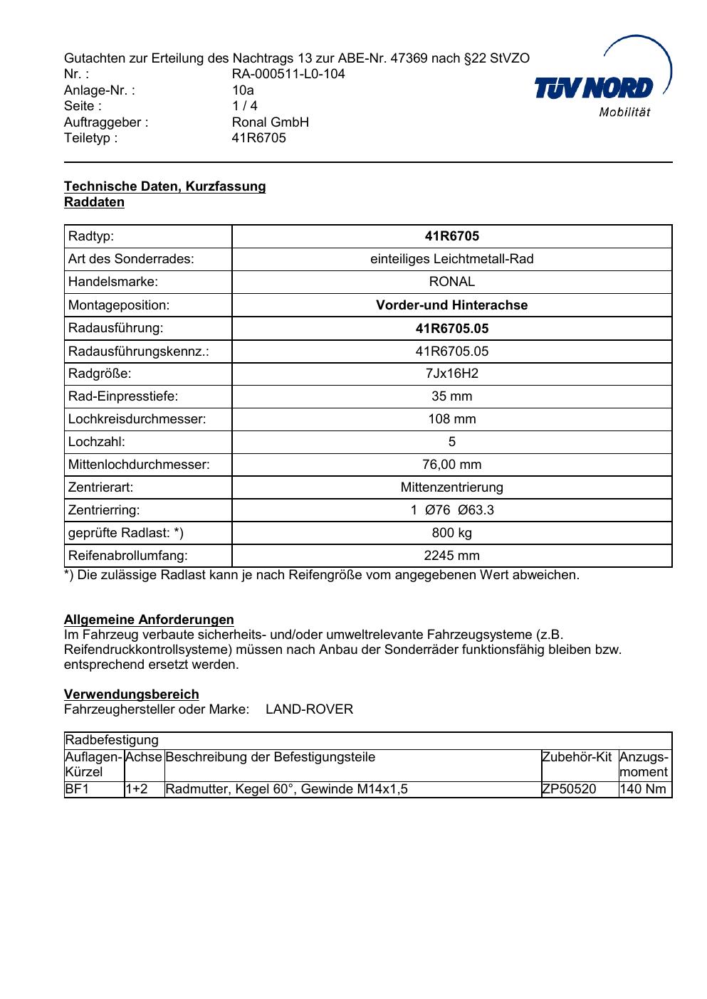 Dieses Gutachten (abe) bezieht sich auf die Alufelge brand-ronal 41R6705 in der Ausführung 7Jx16 ET 0, Mittenloch 0 mm (KBA 47369). Im PDF findest du typischerweise zulässige Reifengrößen, Auflagen/Anbauhinweise und – je nach Dokument – Hinweise zur Eintragung.