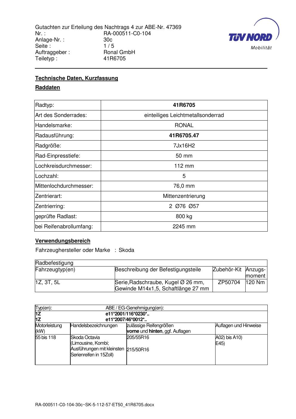Dieses Gutachten (abe) bezieht sich auf die Alufelge brand-ronal 41R6705 in der Ausführung 7Jx16 ET 0, Mittenloch 0 mm (KBA 47369). Im PDF findest du typischerweise zulässige Reifengrößen, Auflagen/Anbauhinweise und – je nach Dokument – Hinweise zur Eintragung.