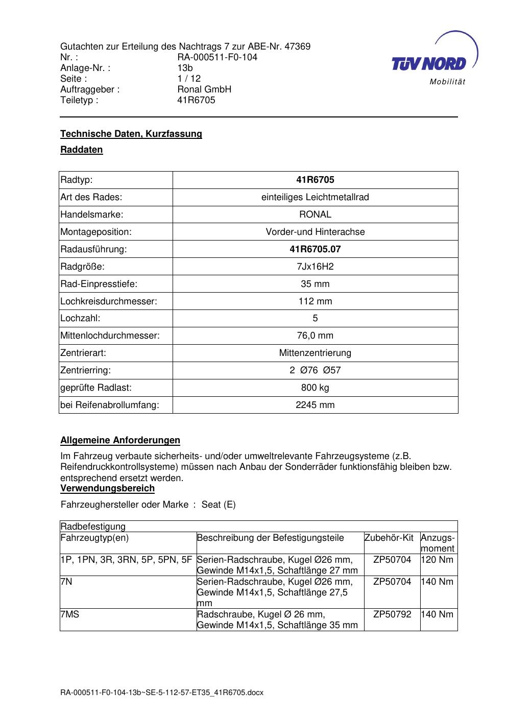 Dieses Gutachten (abe) bezieht sich auf die Alufelge brand-ronal 41R6705 in der Ausführung 7Jx16 ET 0, Mittenloch 0 mm (KBA 47369). Im PDF findest du typischerweise zulässige Reifengrößen, Auflagen/Anbauhinweise und – je nach Dokument – Hinweise zur Eintragung.