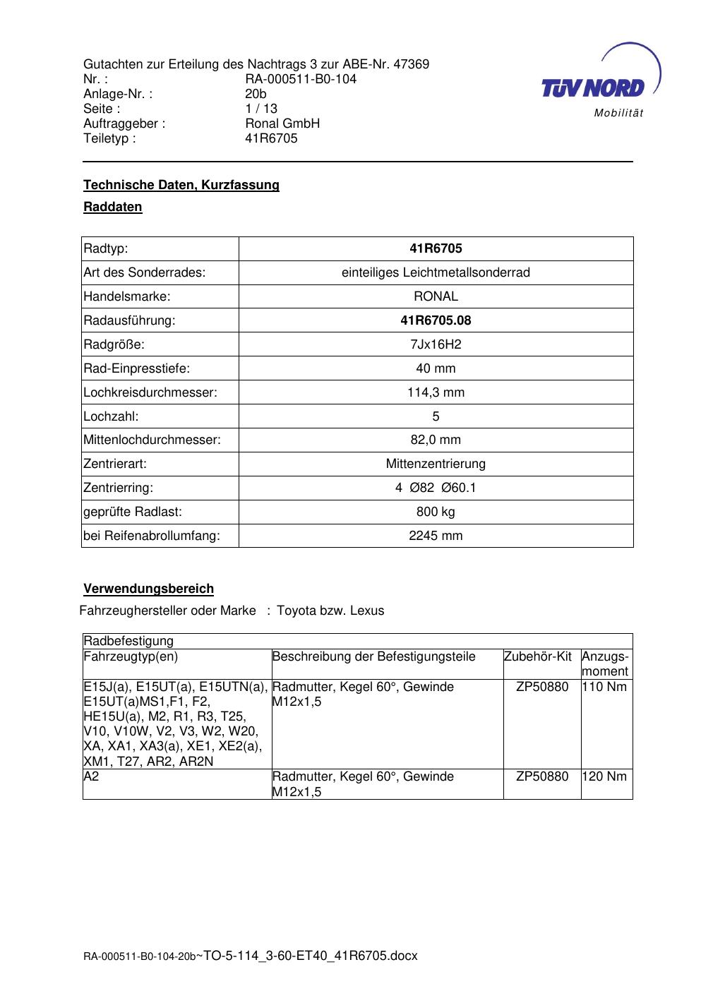 Dieses Gutachten (abe) bezieht sich auf die Alufelge brand-ronal 41R6705 in der Ausführung 7Jx16 ET 0, Mittenloch 0 mm (KBA 47369). Im PDF findest du typischerweise zulässige Reifengrößen, Auflagen/Anbauhinweise und – je nach Dokument – Hinweise zur Eintragung.