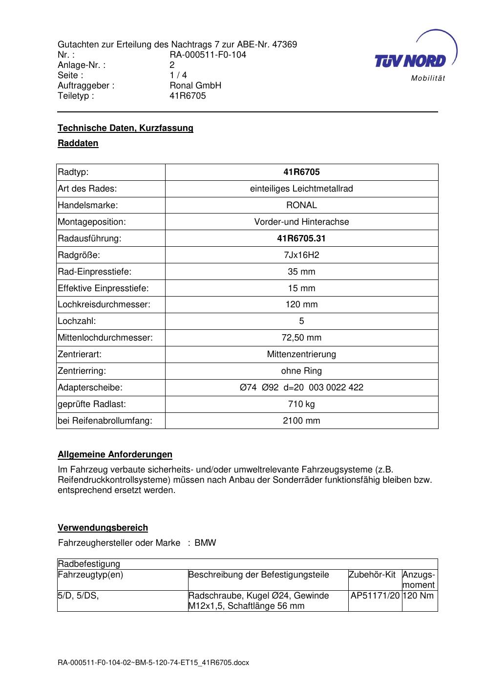 Dieses Gutachten (abe) bezieht sich auf die Alufelge brand-ronal 41R6705 in der Ausführung 7Jx16 ET 0, Mittenloch 0 mm (KBA 47369). Im PDF findest du typischerweise zulässige Reifengrößen, Auflagen/Anbauhinweise und – je nach Dokument – Hinweise zur Eintragung.