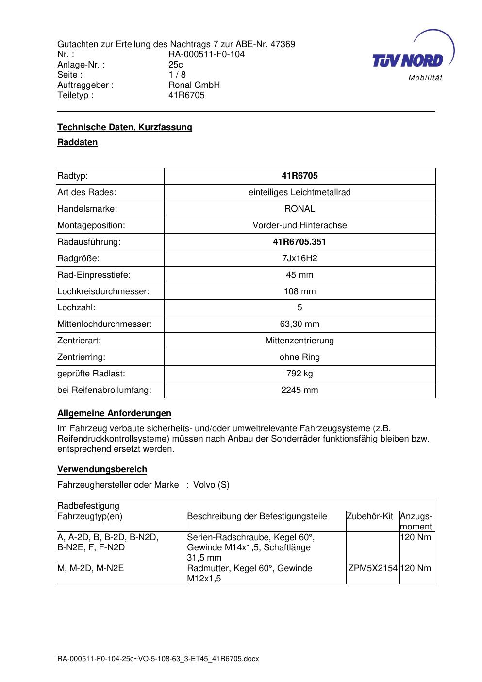 Dieses Gutachten (abe) bezieht sich auf die Alufelge brand-ronal 41R6705 in der Ausführung 7Jx16 ET 0, Mittenloch 0 mm (KBA 47369). Im PDF findest du typischerweise zulässige Reifengrößen, Auflagen/Anbauhinweise und – je nach Dokument – Hinweise zur Eintragung.