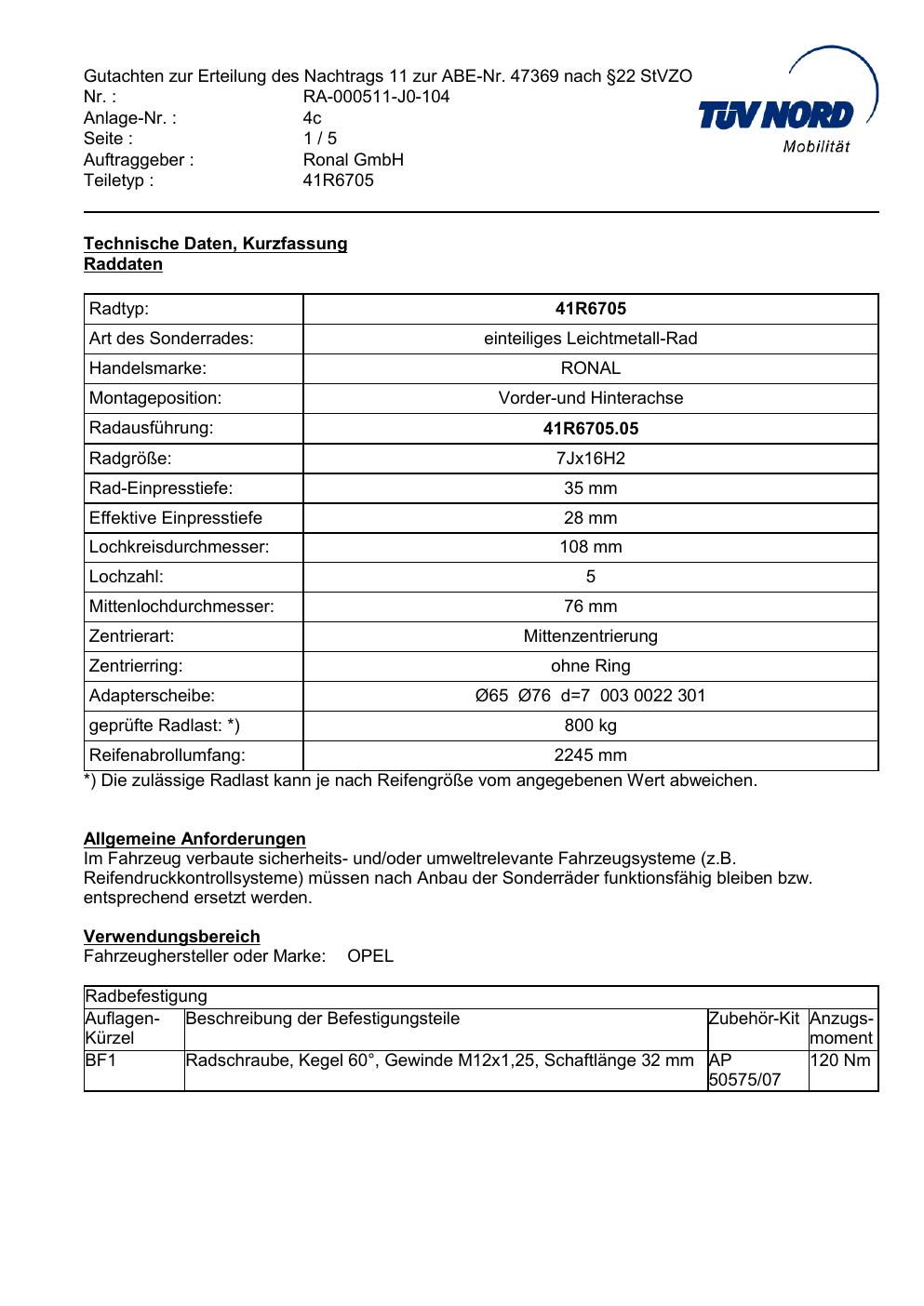 Dieses Gutachten (abe) bezieht sich auf die Alufelge brand-ronal 41R6705 in der Ausführung 7Jx16 ET 0, Mittenloch 0 mm (KBA 47369). Im PDF findest du typischerweise zulässige Reifengrößen, Auflagen/Anbauhinweise und – je nach Dokument – Hinweise zur Eintragung.