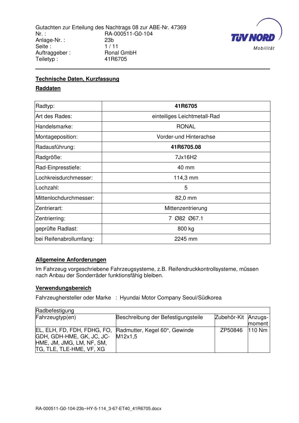 Dieses Gutachten (abe) bezieht sich auf die Alufelge brand-ronal 41R6705 in der Ausführung 7Jx16 ET 0, Mittenloch 0 mm (KBA 47369). Im PDF findest du typischerweise zulässige Reifengrößen, Auflagen/Anbauhinweise und – je nach Dokument – Hinweise zur Eintragung.