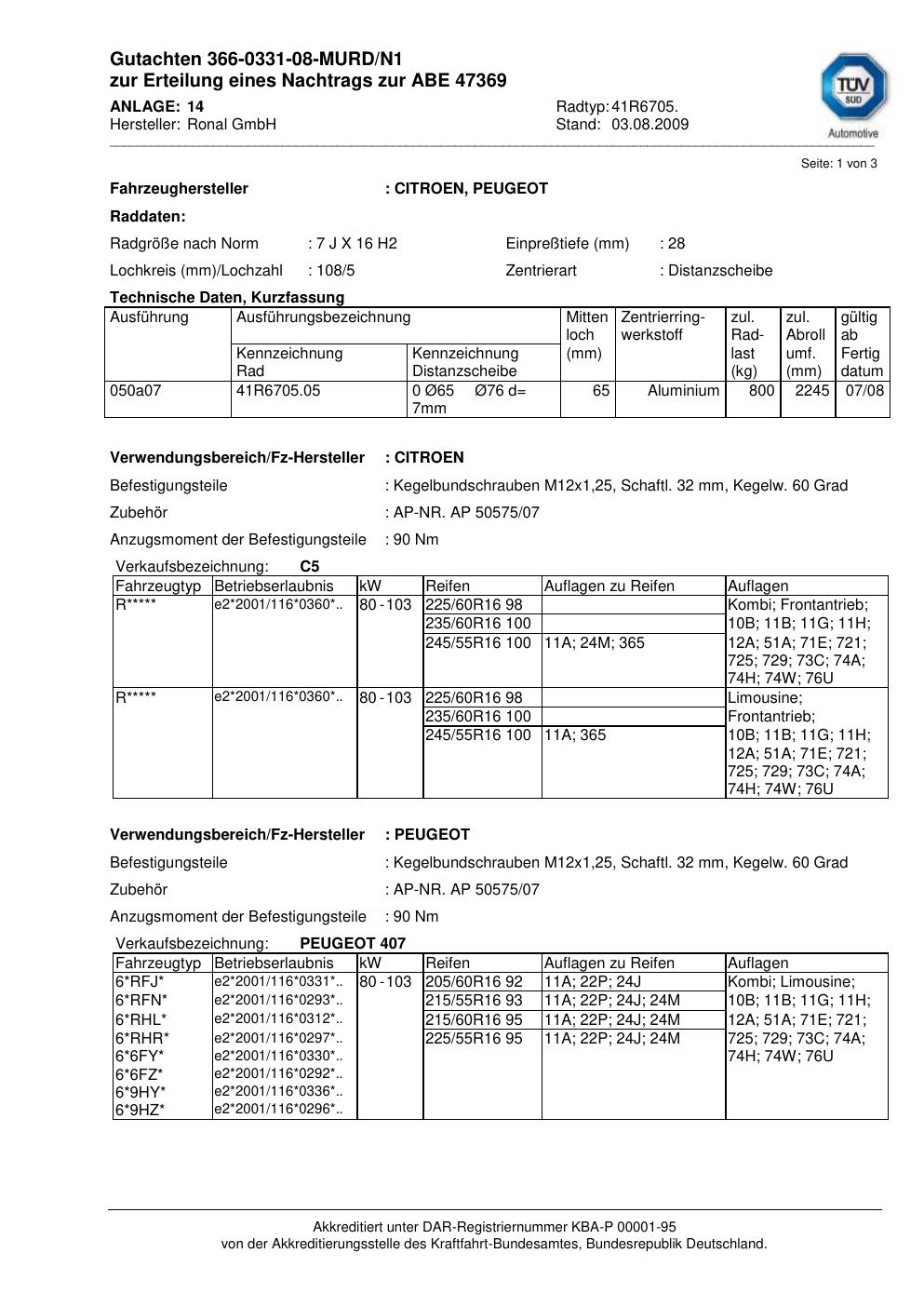 Dieses Gutachten (abe) bezieht sich auf die Alufelge brand-ronal 41R6705 in der Ausführung 7Jx16 ET 0, Mittenloch 0 mm (KBA 47369). Im PDF findest du typischerweise zulässige Reifengrößen, Auflagen/Anbauhinweise und – je nach Dokument – Hinweise zur Eintragung.