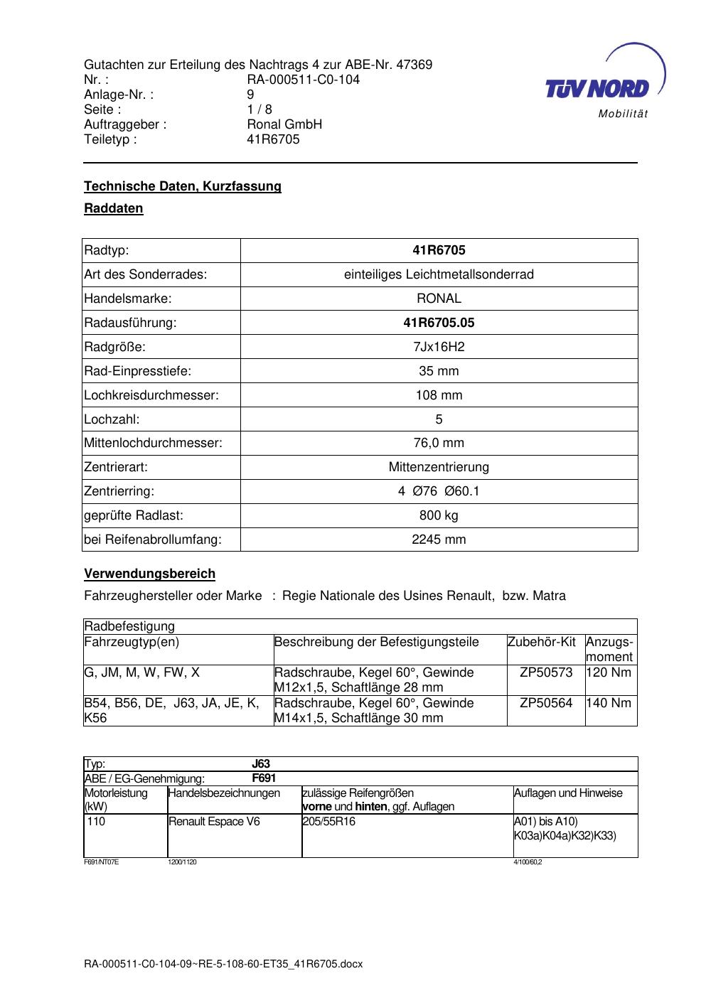 Dieses Gutachten (abe) bezieht sich auf die Alufelge brand-ronal 41R6705 in der Ausführung 7Jx16 ET 0, Mittenloch 0 mm (KBA 47369). Im PDF findest du typischerweise zulässige Reifengrößen, Auflagen/Anbauhinweise und – je nach Dokument – Hinweise zur Eintragung.