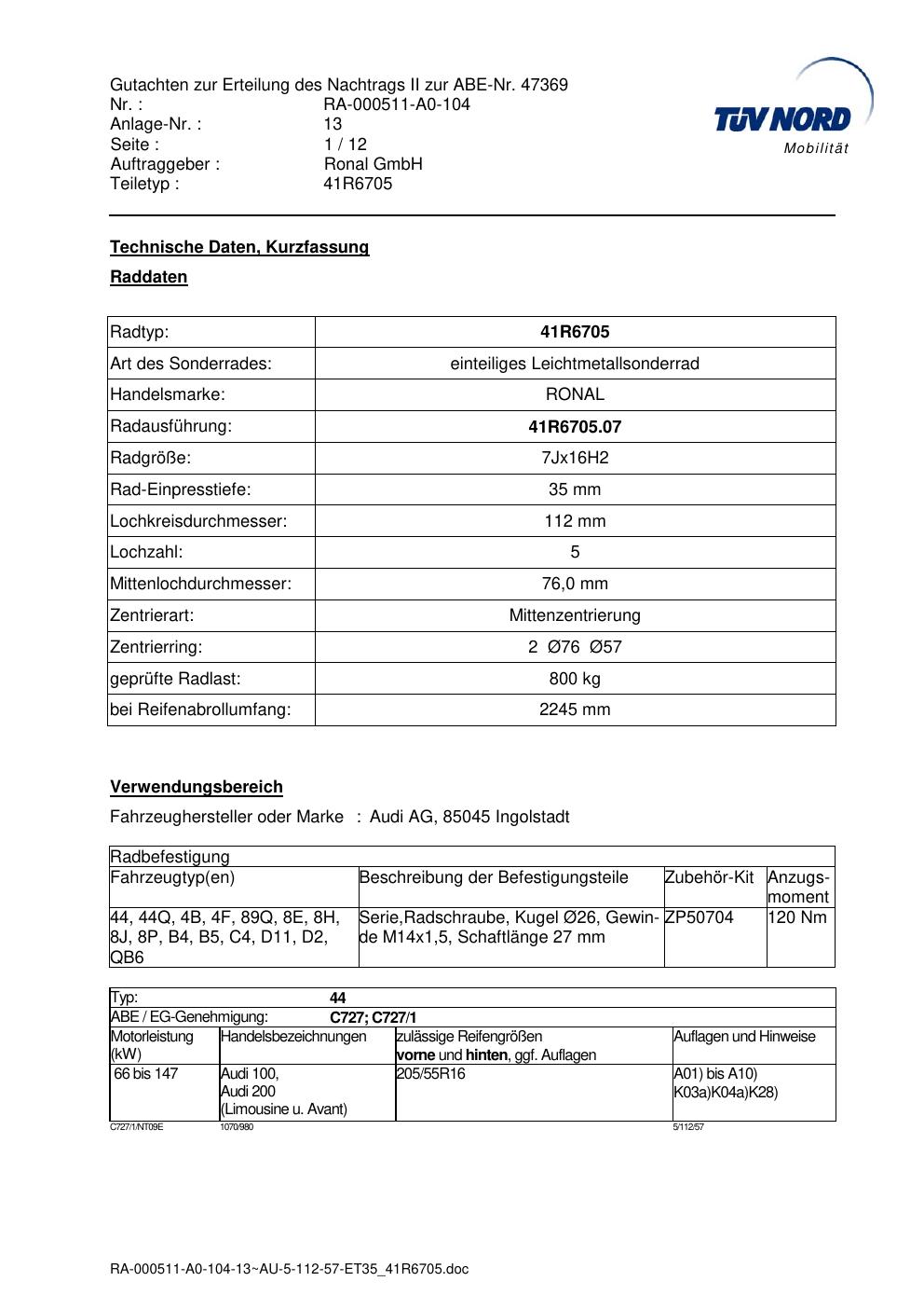 Dieses Gutachten (abe) bezieht sich auf die Alufelge brand-ronal 41R6705 in der Ausführung 7Jx16 ET 0, Mittenloch 0 mm (KBA 47369). Im PDF findest du typischerweise zulässige Reifengrößen, Auflagen/Anbauhinweise und – je nach Dokument – Hinweise zur Eintragung.