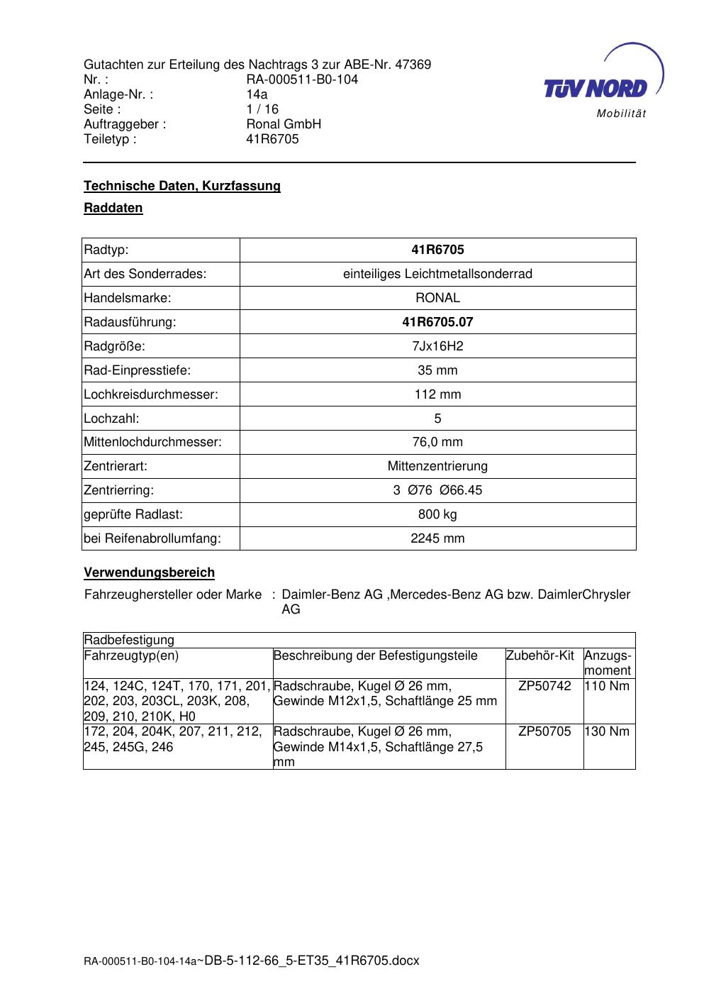Dieses Gutachten (abe) bezieht sich auf die Alufelge brand-ronal 41R6705 in der Ausführung 7Jx16 ET 0, Mittenloch 0 mm (KBA 47369). Im PDF findest du typischerweise zulässige Reifengrößen, Auflagen/Anbauhinweise und – je nach Dokument – Hinweise zur Eintragung.