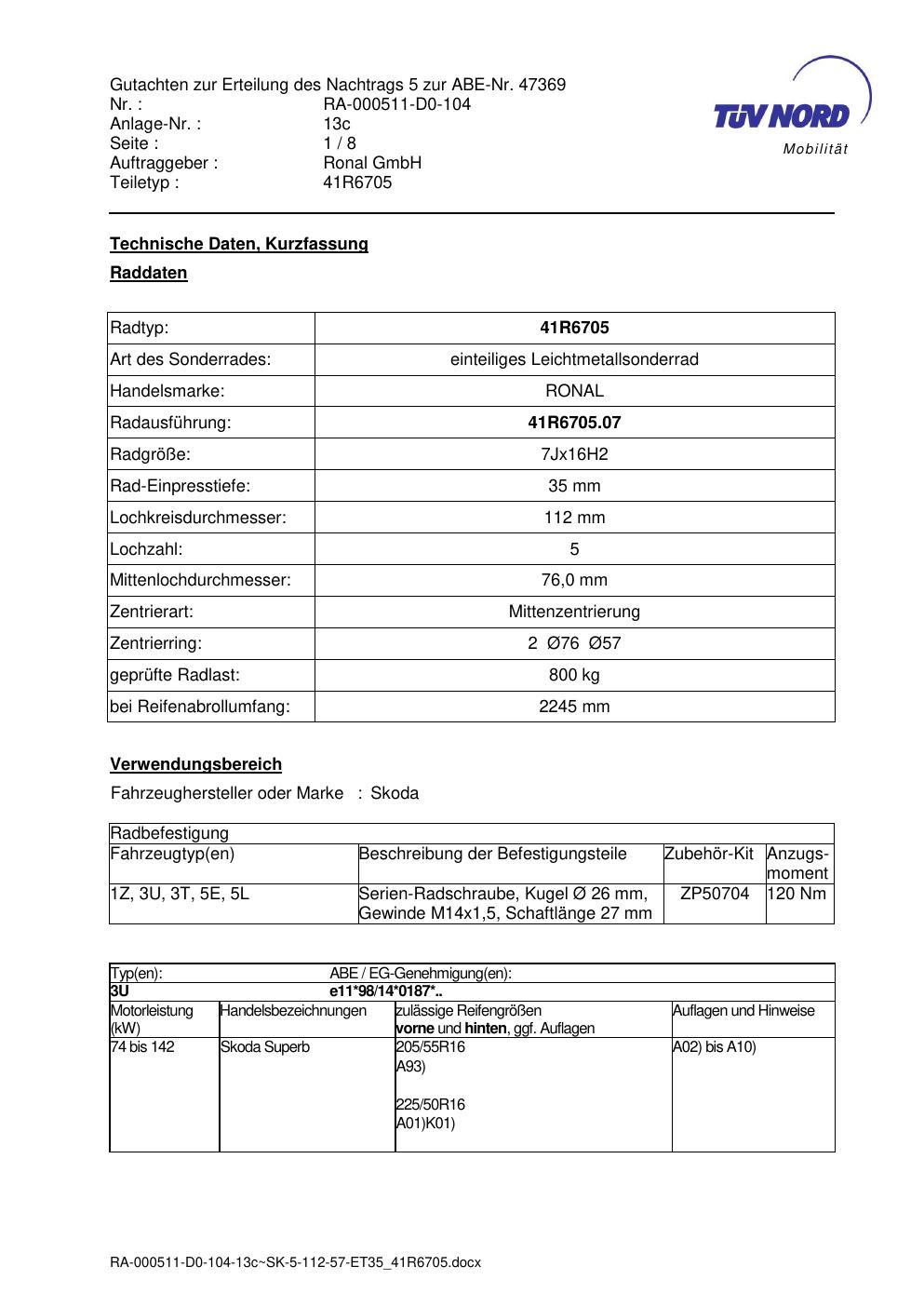 Dieses Gutachten (abe) bezieht sich auf die Alufelge brand-ronal 41R6705 in der Ausführung 7Jx16 ET 0, Mittenloch 0 mm (KBA 47369). Im PDF findest du typischerweise zulässige Reifengrößen, Auflagen/Anbauhinweise und – je nach Dokument – Hinweise zur Eintragung.