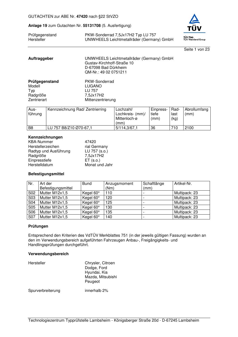 Dieses Gutachten (abe) bezieht sich auf die Alufelge brand-rial LU 757 in der Ausführung 7.5Jx17 ET 0, Mittenloch 0 mm (KBA 47420). Im PDF findest du typischerweise zulässige Reifengrößen, Auflagen/Anbauhinweise und – je nach Dokument – Hinweise zur Eintragung.