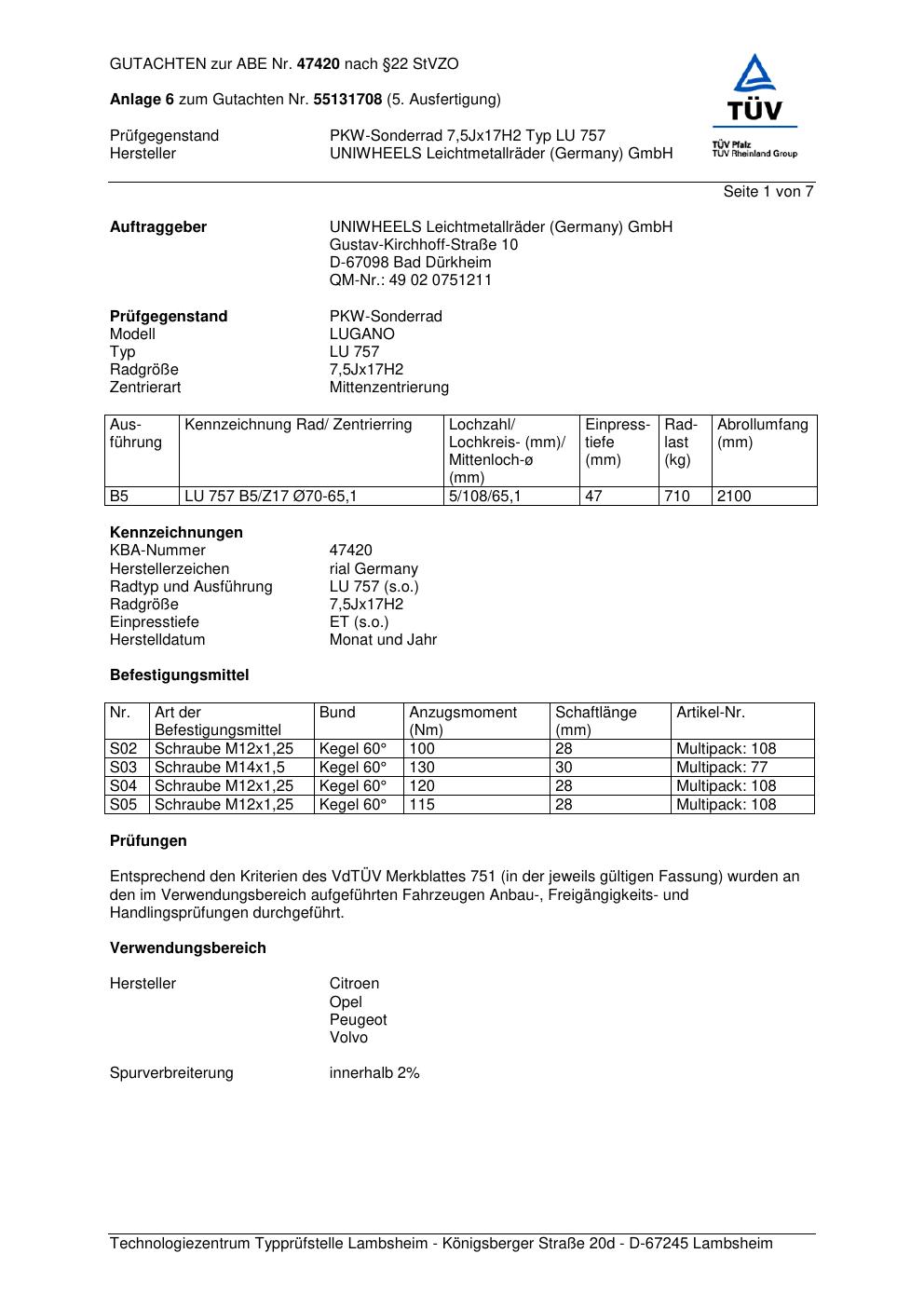 Dieses Gutachten (abe) bezieht sich auf die Alufelge brand-rial LU 757 in der Ausführung 7.5Jx17 ET 0, Mittenloch 0 mm (KBA 47420). Im PDF findest du typischerweise zulässige Reifengrößen, Auflagen/Anbauhinweise und – je nach Dokument – Hinweise zur Eintragung.