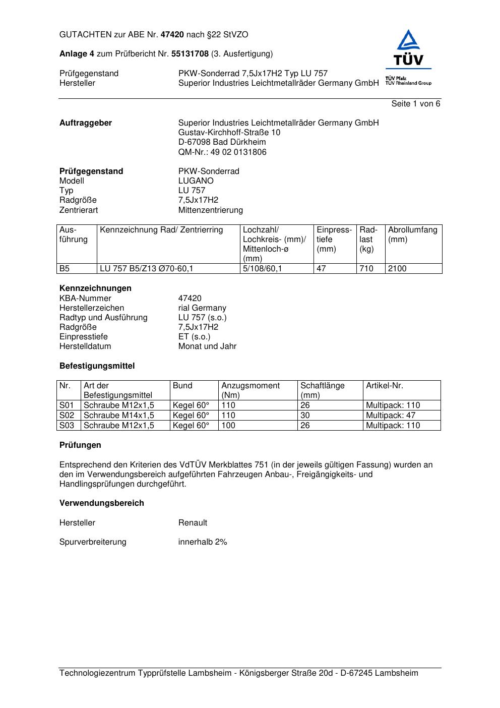 Dieses Gutachten (abe) bezieht sich auf die Alufelge brand-rial LU 757 in der Ausführung 7.5Jx17 ET 0, Mittenloch 0 mm (KBA 47420). Im PDF findest du typischerweise zulässige Reifengrößen, Auflagen/Anbauhinweise und – je nach Dokument – Hinweise zur Eintragung.