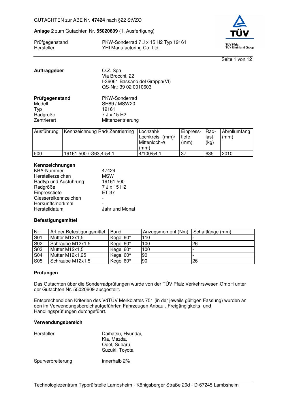 Dieses Gutachten (abe) bezieht sich auf die Alufelge ATS 19161 in der Ausführung 7Jx15 ET 0, Mittenloch 0 mm (KBA 47424). Im PDF findest du typischerweise zulässige Reifengrößen, Auflagen/Anbauhinweise und – je nach Dokument – Hinweise zur Eintragung.